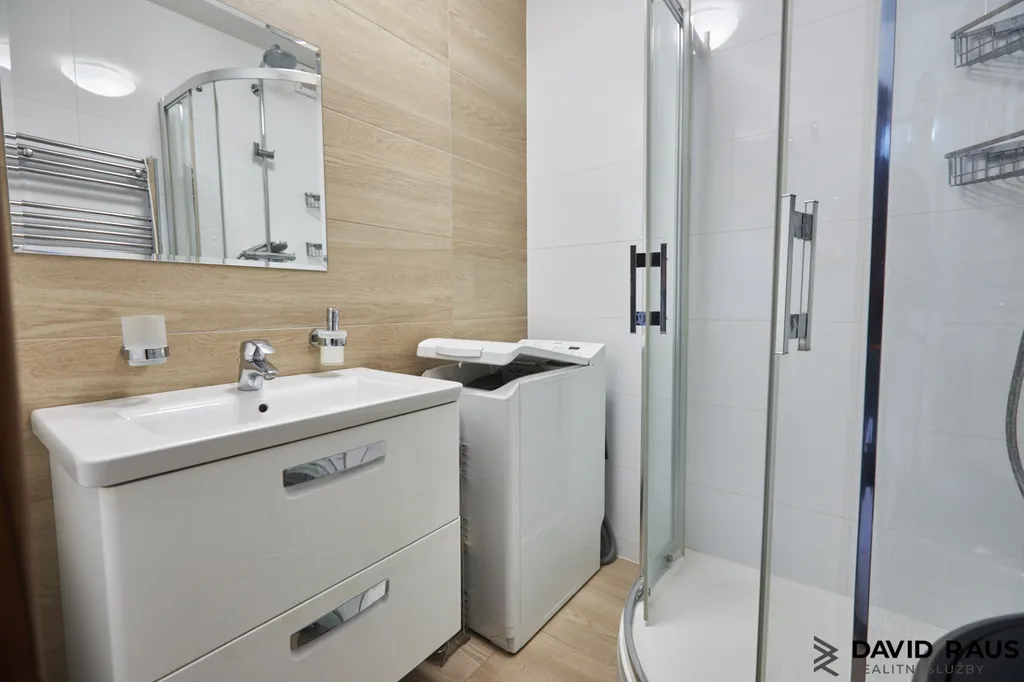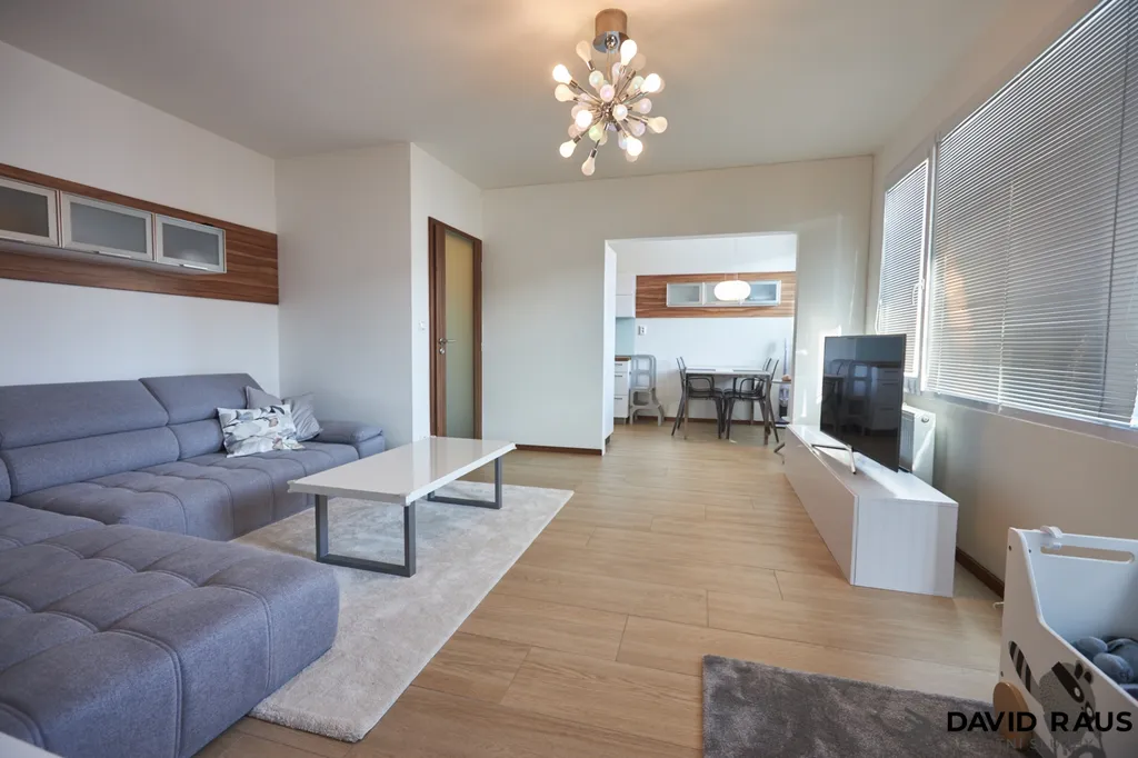 Zařízení celého bytu je v moderním designu, dřevěný dekor podlahy v obytných místnostech se skvěle doplňuje s nábytkem, celý prostor tak působí vzdušně a útulně. Bílá kuchyňská linka dokonale ladí s celým interiérem