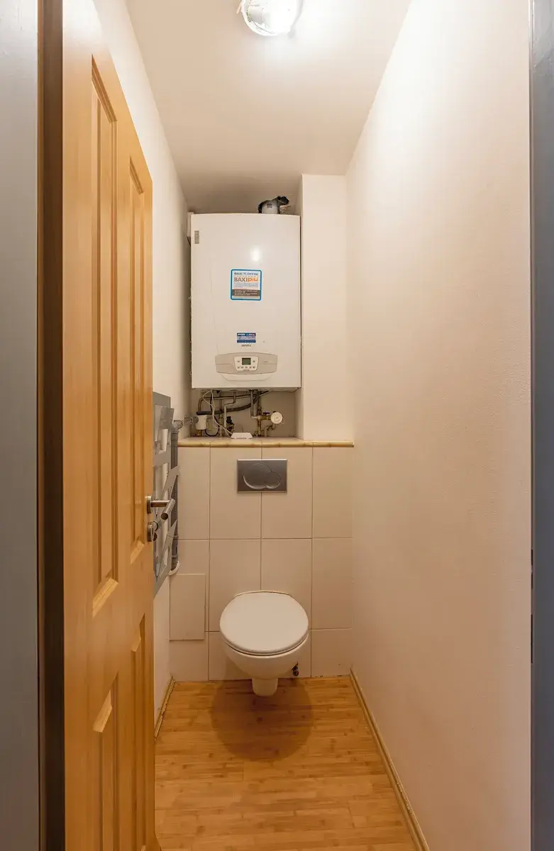 Vytápění vlastním kotlem. Podlahy marmoleum.