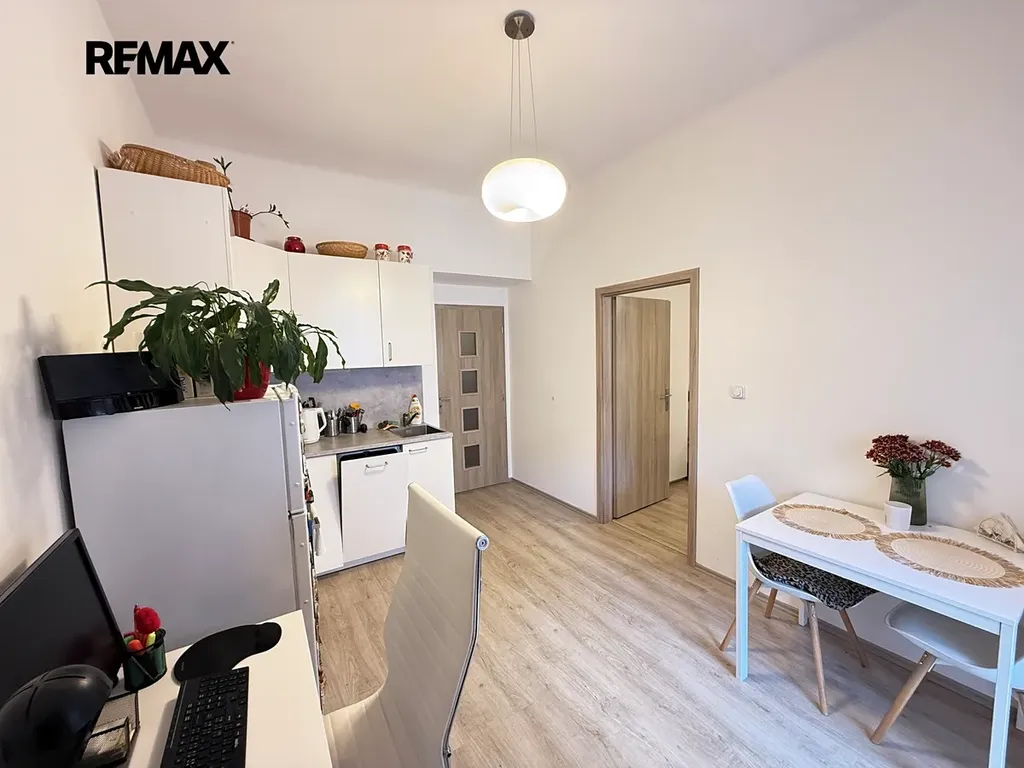 Dispozičně je byt řešen jako 2kk - kuchyně s balkonem 3m2, kde je místo pro příjemné posezení. Na balkon je vyvedena zásuvka i osvětlení, je zde šňůra na prádlo. Kuchyňská linka se sporákem, digestoří, troubou i myčkou na nádobí. U kuchyně je praktická komora/spíž s oknem a policovým systémem.
