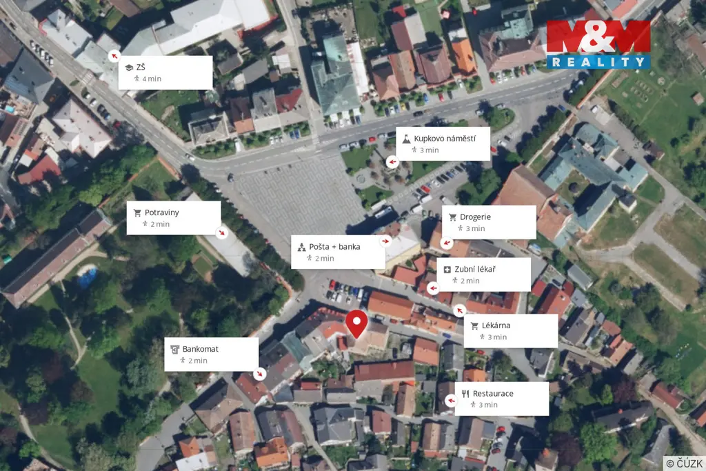 Výborná poloha v centru obce u Kupkova náměstí s atraktivním potenciálem pro pronájem nebo prodej jednotek.