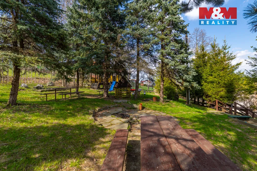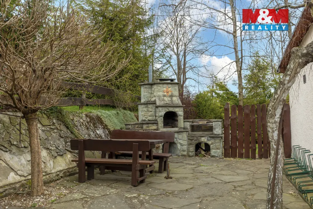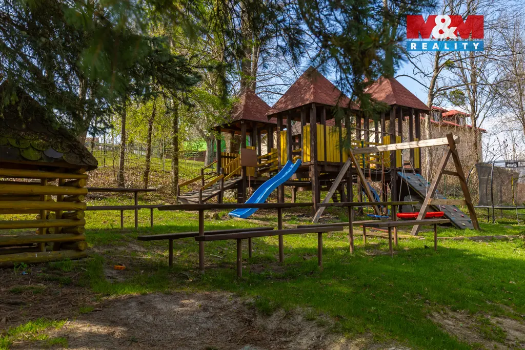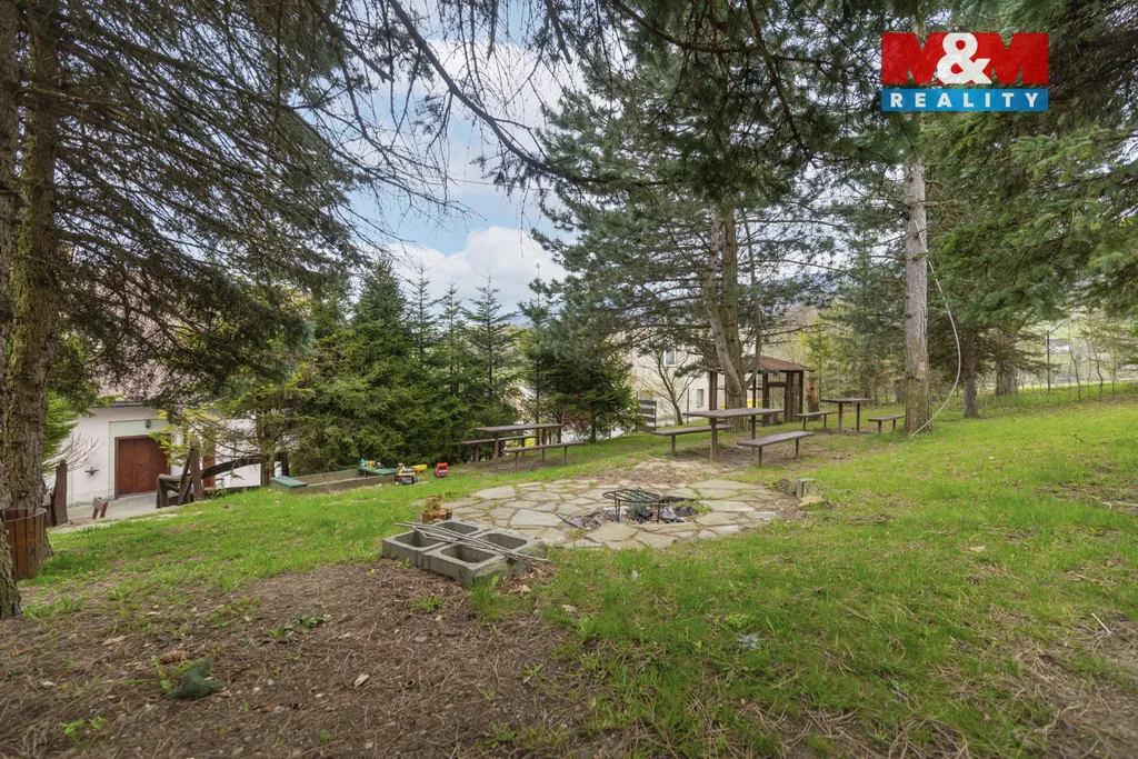 Na zahrádce je vybudováno posezení s krbem, dětské hřiště a dvě studny.