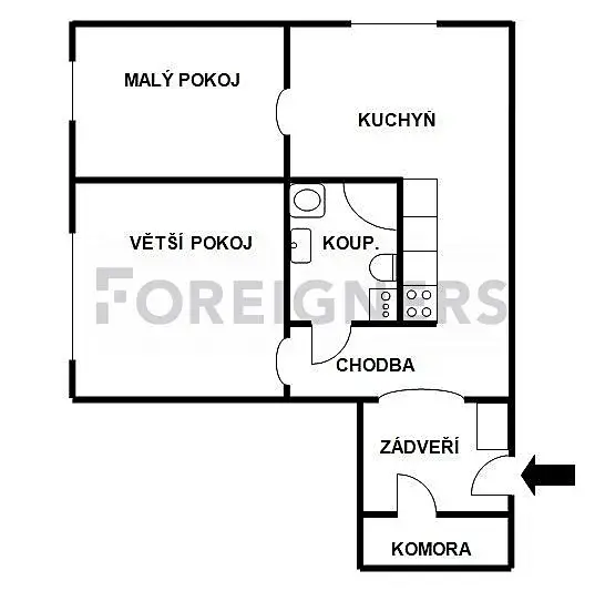 Byt s rozlohou 45 m2 disponuje dvěma samostatnými pokoji, komorou, koupelnou se záchodem a kuchyní s jídelním koutem.