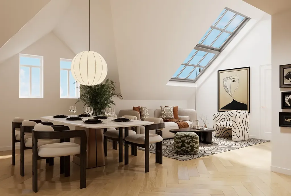 Velkoformátová elektricky ovládaná střešní okna značky Solarlux (SUNSLIDER) přinášejí do interiéru mimořádné množství přirozeného světla a umocňují jedinečnou atmosféru podkrovního bydlení. Sofistikovaný systém s hliníkovou konstrukcí a izolačním trojsklem zajišťuje vysoký komfort i funkčnost v každodenním užívání.