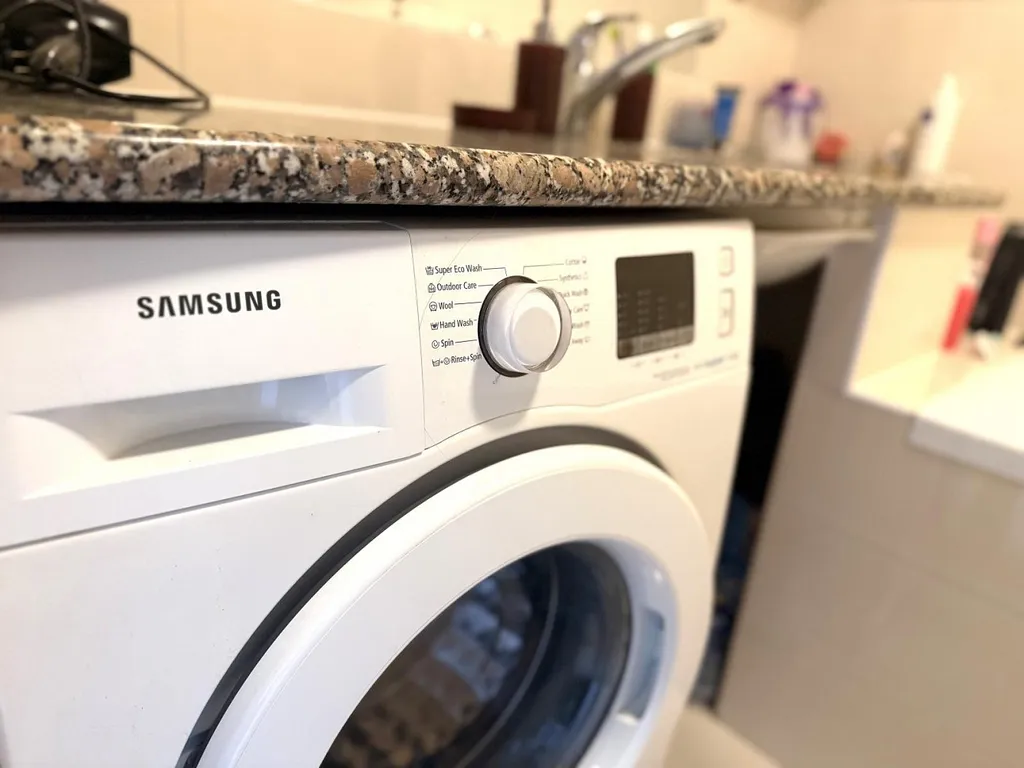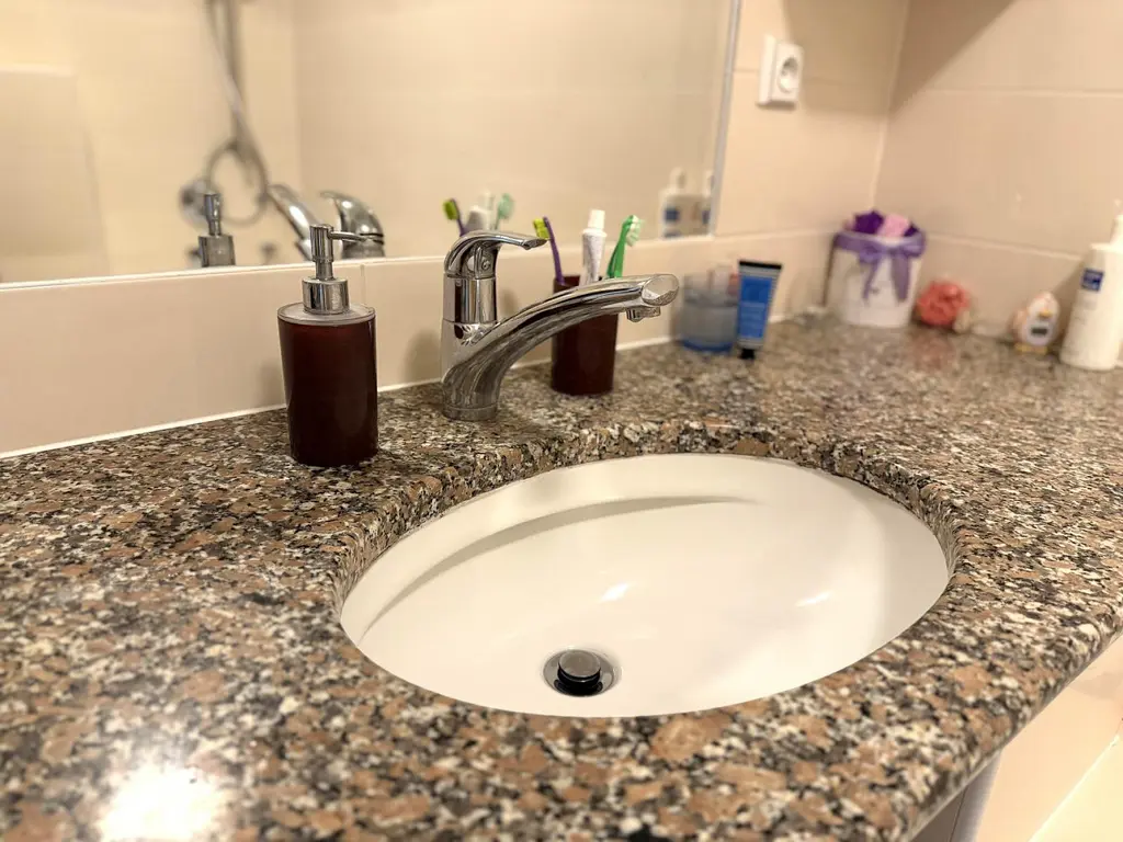 Z již zmíněné chodby je také přístup do koupelny o celkové ploše cca 5,1 m and sup2;. V této koupelně se nachází vana, toaleta, otopný žebřík a pračka. Navíc tu je velké zrcadlo, což opticky zvětšuje prostor místnosti.