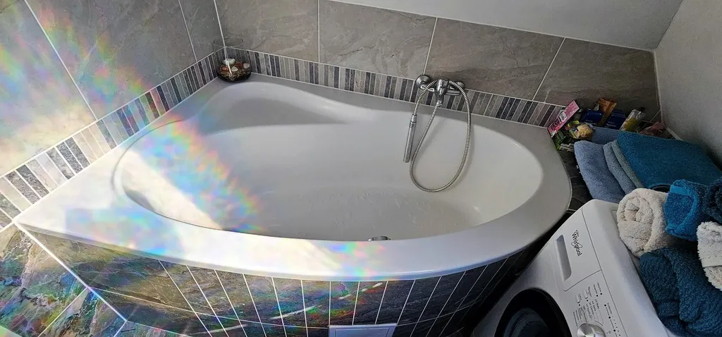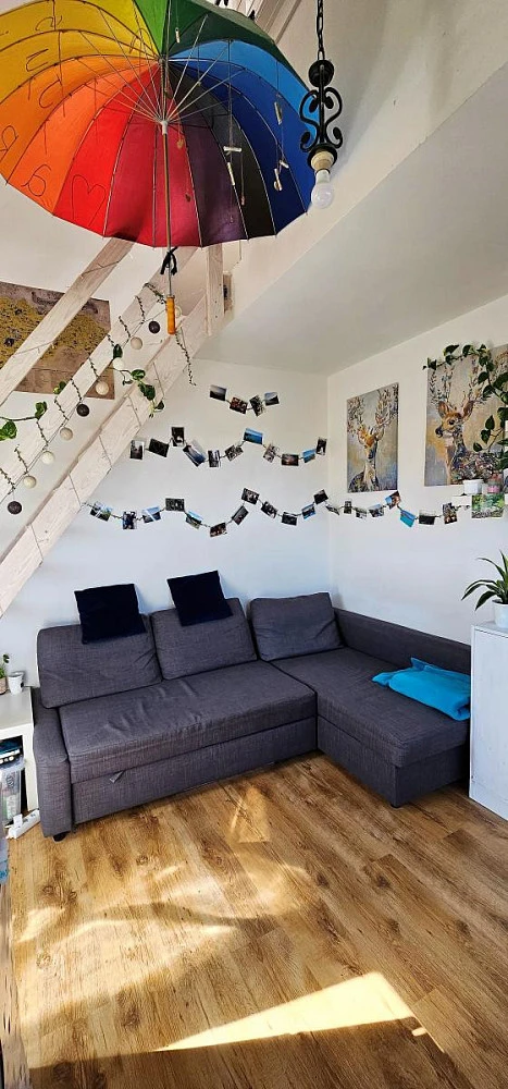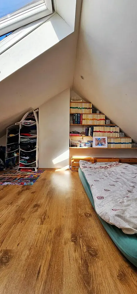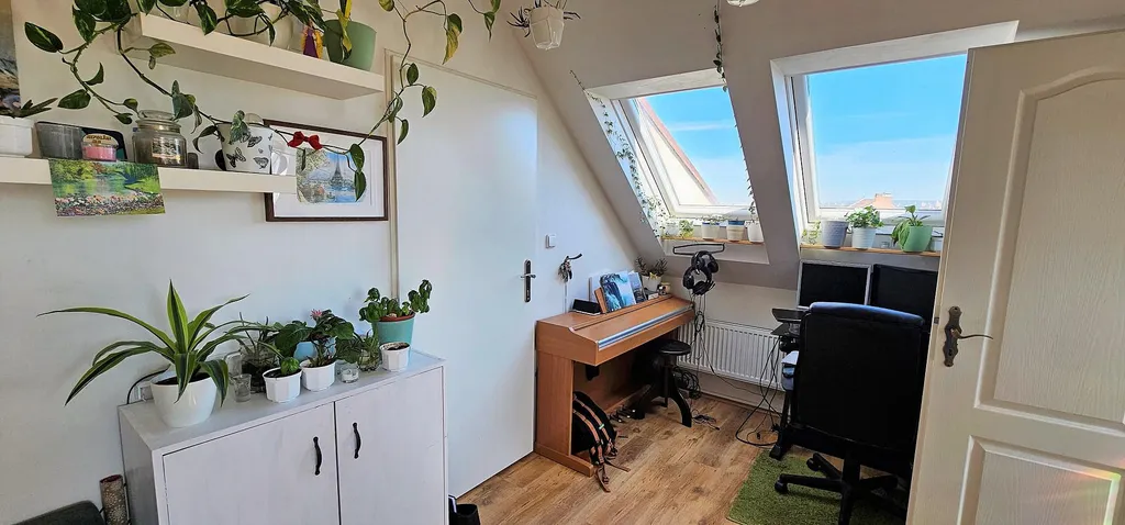 Bytová jednotka se nachází v posledním patře bytového domu. Na patře se pouze tento byt. Vstupními dveřmi vejdeme do bytu, kde nás přivítá místnost do tvaru L o výměře cca 15 m². Místnost je obývací pokoj s kuchyní, zároveň slouží jako pracovna a odpočinková část bytu. Koupelna je prostorná, její výměra je cca 3,5m². Je zde WC, rohová vana a umyvadlo. Díky střešnímu oknu je místnost krásně prosvícená denním světlem. Kuchyň je na míru a vypadá moc pěkně. Pomocí dřevěného schodiště vejdeme do mezonetu o celkové ploše cca 7,8m², který slouží jako úložný prostor a zejména spací část.