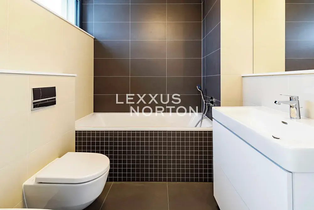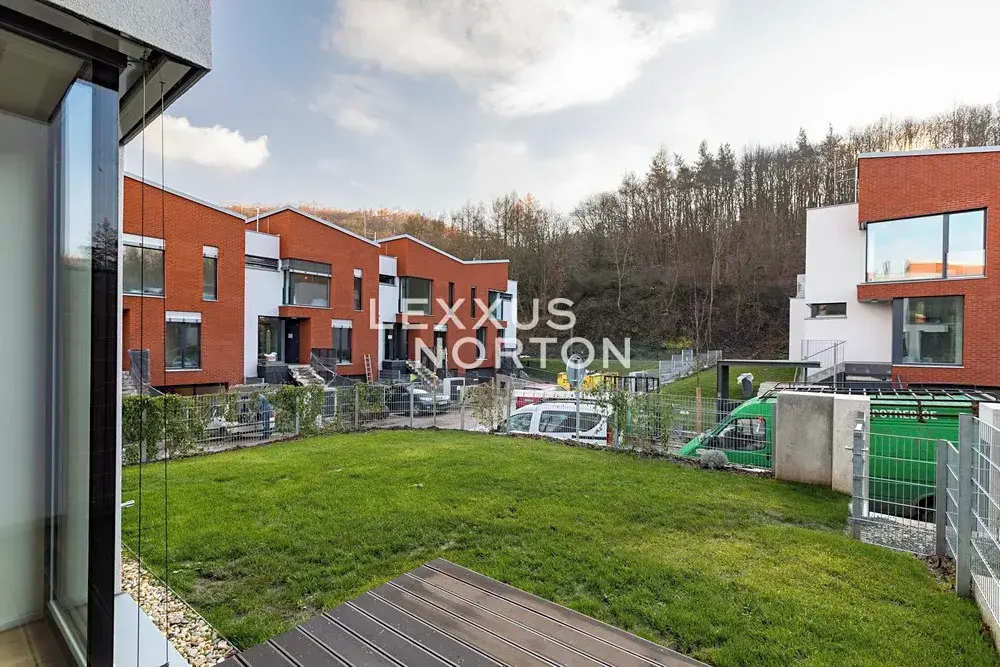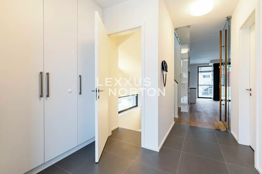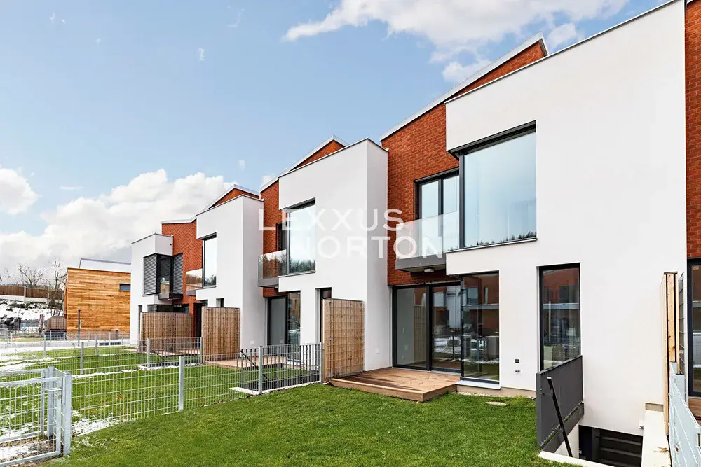 Dispozice domu zahrnuje prostornou vstupní halu, vzdušný obývací pokoj propojený s jídelnou a plně vybaveným moderním kuchyňským koutem, čtyři ložnice, tři koupelny, šatnu, prádelnu, fitness místnost a technické zázemí. K domu náleží také balkon, terasa se zahradou a dvě garážová parkovací stání.