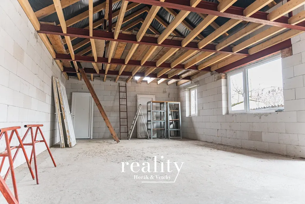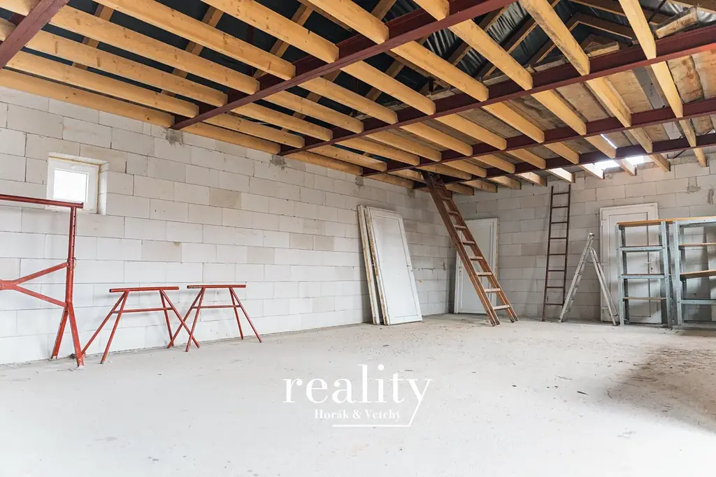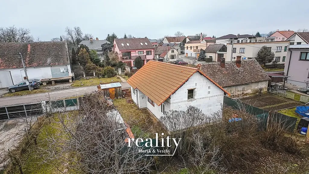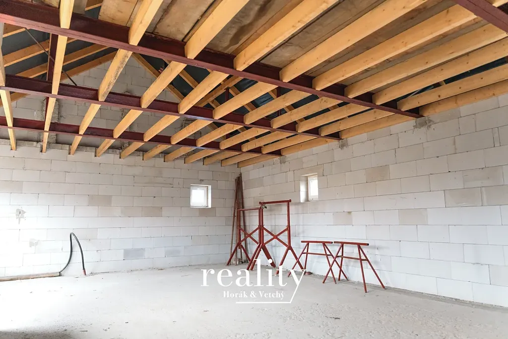 Na rovinatém pozemku o výměře 223 m² se nachází dům ve fázi uzavřené hrubé stavby. Výhodou je, že je stavba napojena na veškeré inženýrské sítě.