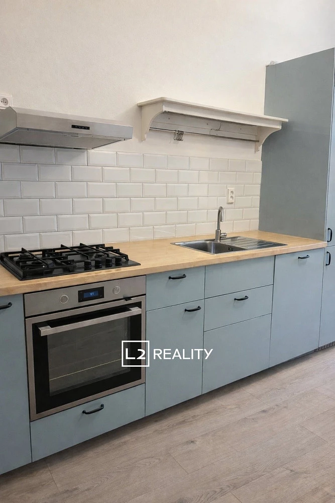 Je vybaven novou kuchyní s myčkou, lednicí, troubou, koupelnou s vanou, pračkou i prostornými skříněmi.
