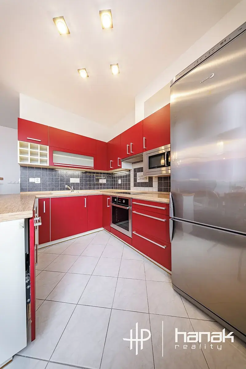 Kuchyňská linka v tvaru písmene U je vybavena lednicí s mrazákem, indukční deskou, horkovzdušnou troubou, digestoří, mikrovlnou troubou a granitovým dřezem.