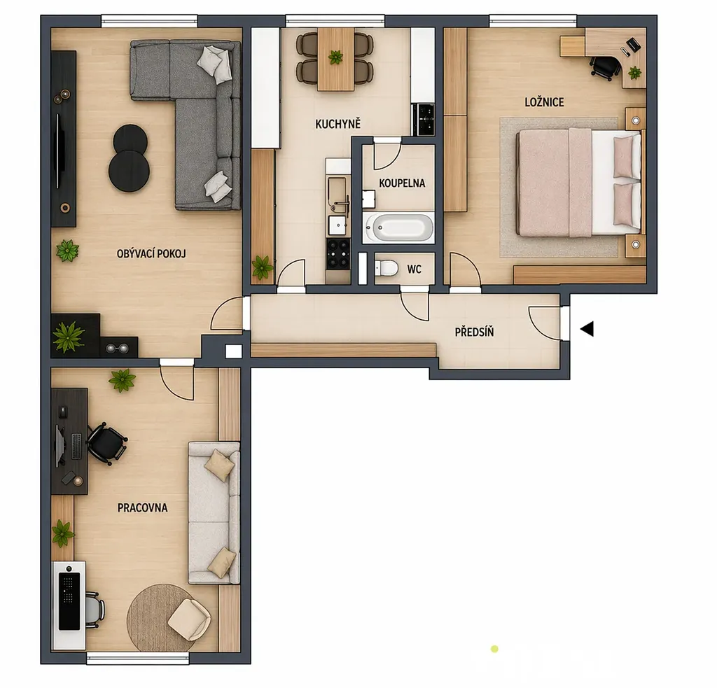 Byt se skládá z obývacího pokoje s hezkým výhledem do okolní přírody, odkud je přístup do velkého dětského pokoje. Ze vstupní chodby je přístupná kuchyně s na míru vyrobenou kuchyňskou linkou a vestavnými elektrospotřebiči – lednice s mrazákem, myčka, el. trouba, mikrovlnná trouba, digestoř a nechybí ani granitový dřez s baterií. Také pračka je šikovně umístěna v kuchyňské lince. Z chodby je přístup dále do ložnice, kde se nachází velká na míru vyrobená vestavná skříň. Koupelna s vanou je oddělena od toalety, která je samostatná. I díky prostorné šatní skříni v chodbě byt nabízí dostatek skladovacích prostor.