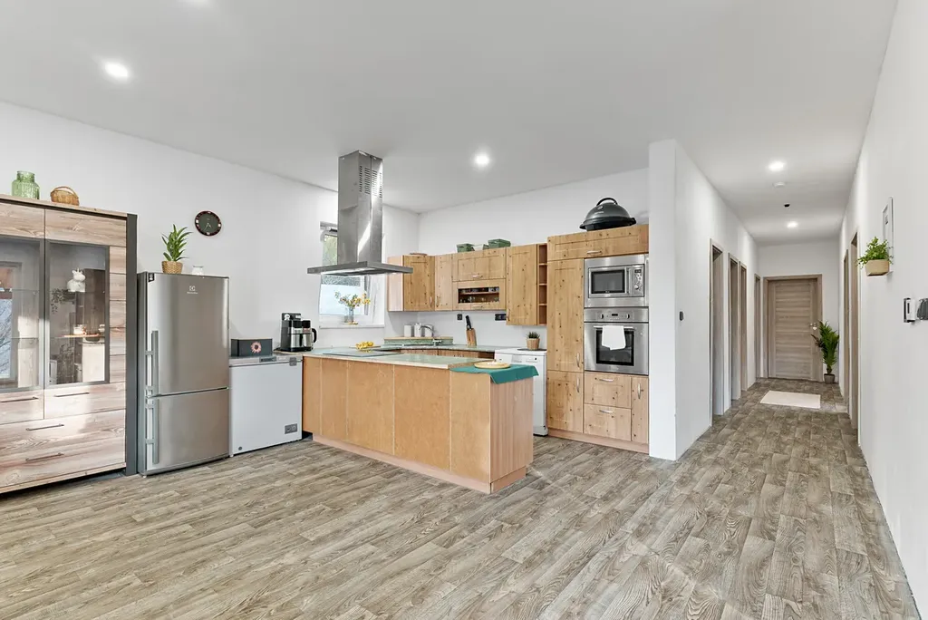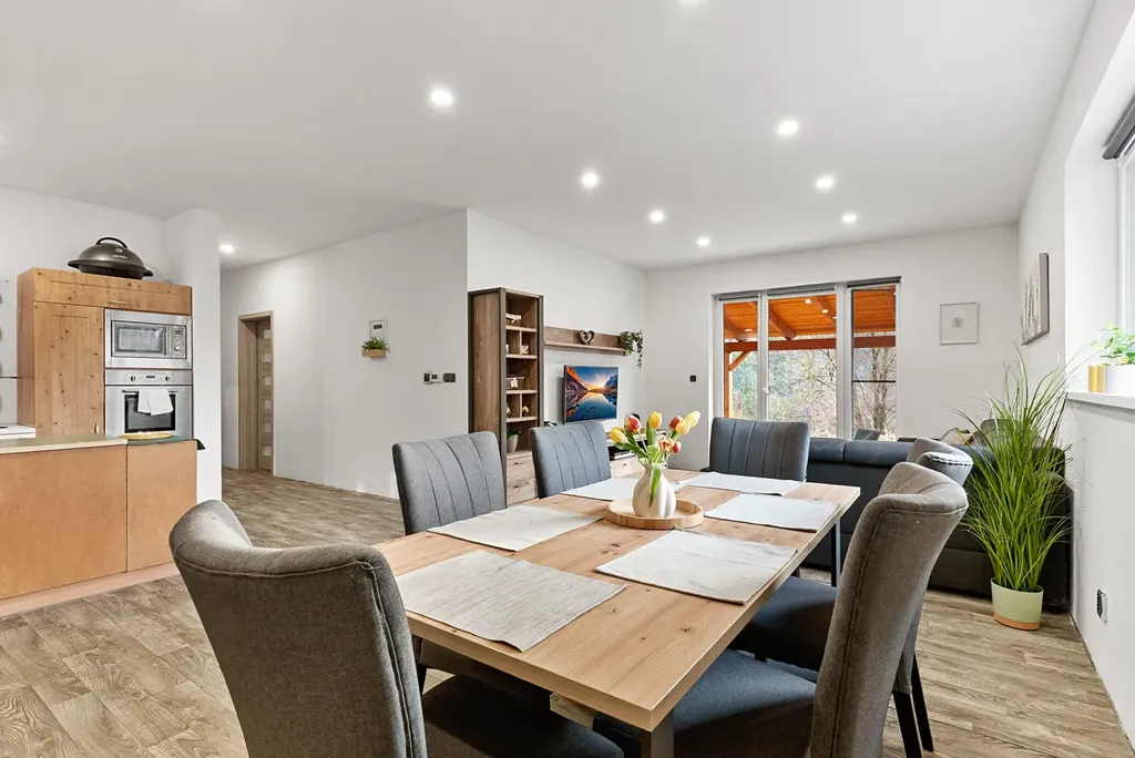 Dominantou nemovitosti je velkorysý obývací pokoj s kuchyňským koutem o velikosti přibližně 40 m², který tvoří přirozené centrum celého domu a poskytuje dostatek místa pro každodenní rodinný život i setkávání s přáteli.