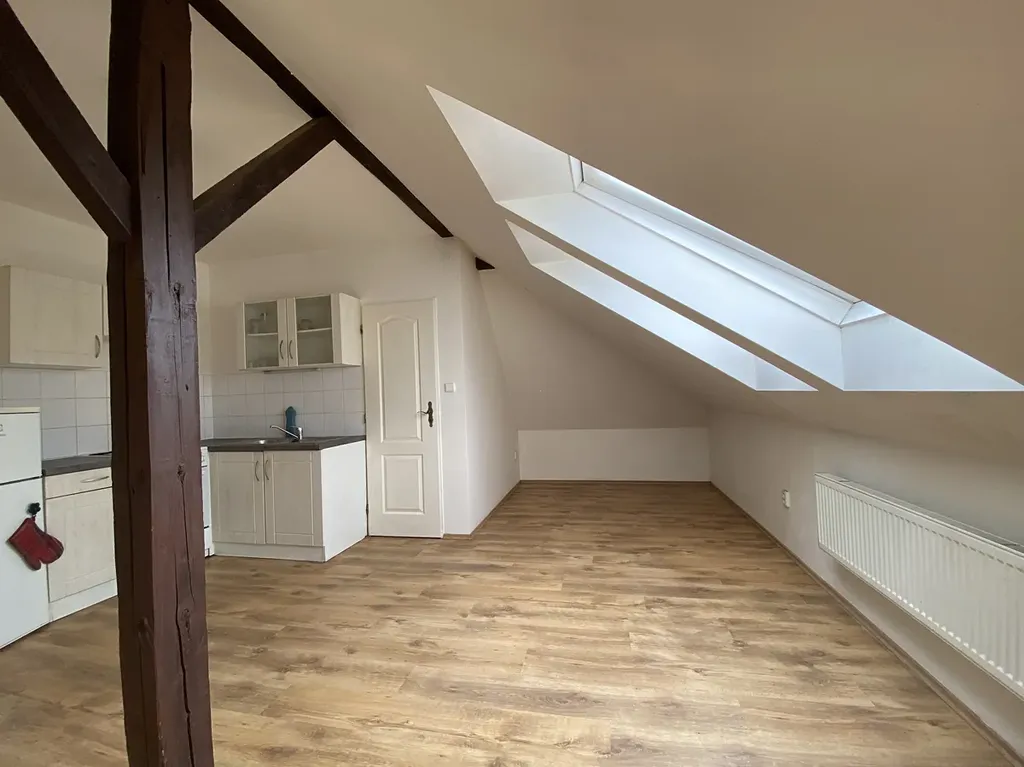 Po vstupu do bytu se ocitneme v předsíni o rozměrech cca 3,50 m2, která nabízí prostor pro uložení věcí. Z předsíně se vstupuje do hlavní obytné místnosti o celkové ploše cca 23,11 m2 s kuchyňským koutem, kde se nachází kuchyňská linka s plynovým sporákem a s troubou v kuchyňský kout je také vybaven lednicí. Místnost je krásně prosvětlená díky dvěma střešním oknům a útulnou atmosféru doplňují přiznané dřevěné trámy. Ze střešních oken je výhled do parku před domem.
