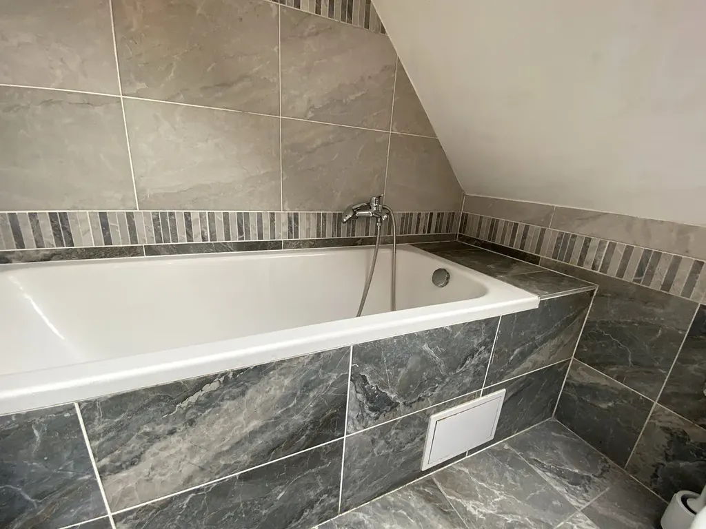Z obytné části je vstup do koupelny, ve které se nachází jedno střešní okno, dále je koupelna vybavena velkou vanou, toaletou, umyvadlovou skříňkou, topným žebříkem a celková výměra této místnosti činí cca 4,39 m2.