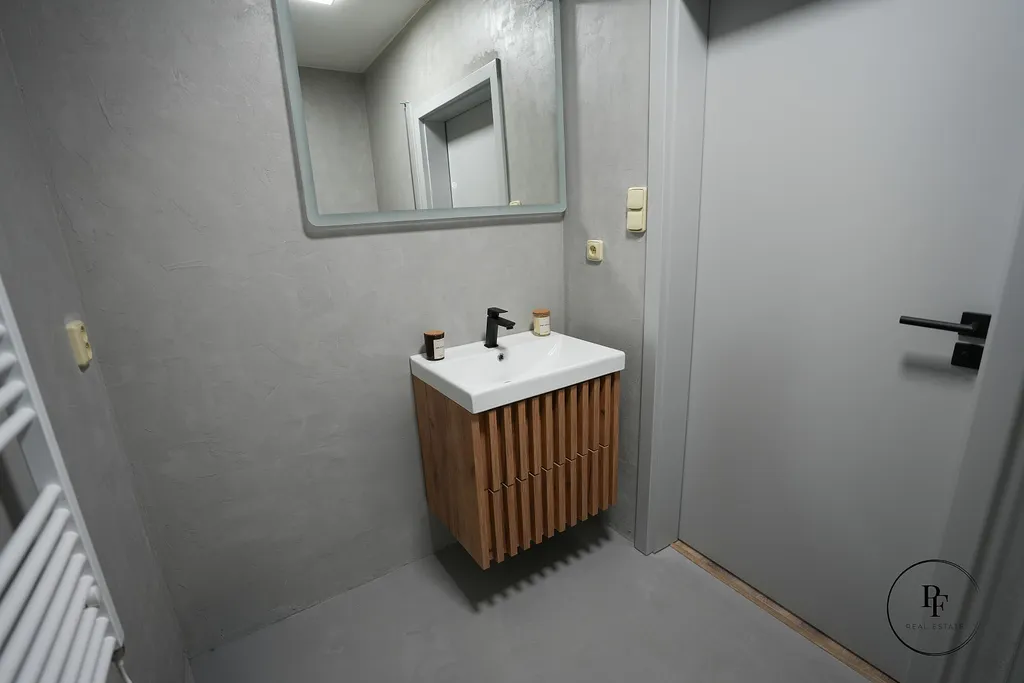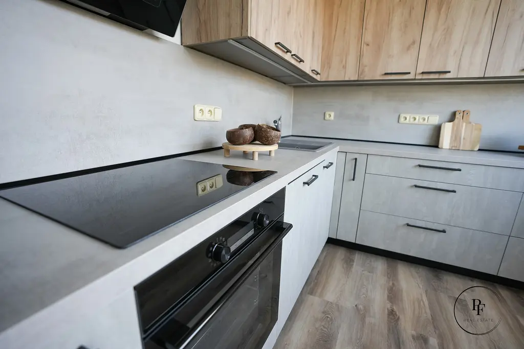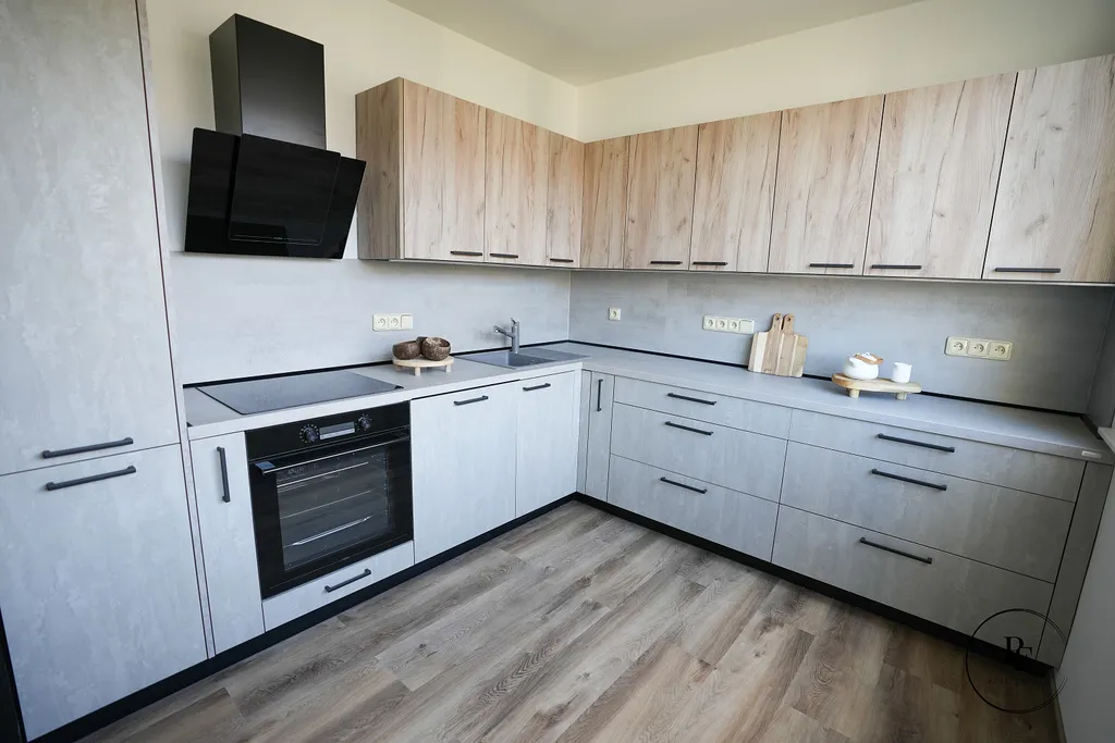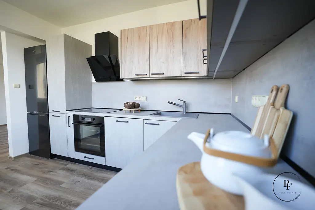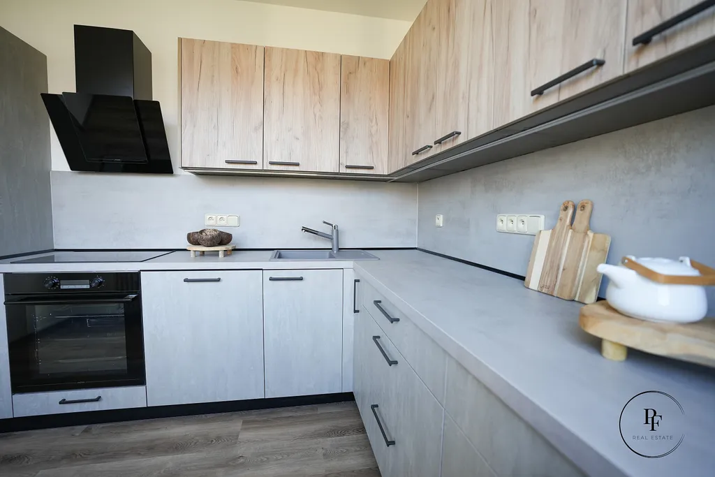 Kuchyň je navržena v kombinaci betonové šedé a přírodního dřeva, má velkorysou pracovní plochu, vestavěnou varnou desku, troubu, digestoř a vysokou lednici. V koupelně je prostorný sprchový kout a celý prostor je moderně stylizovaný do betonové stěrky, která je velmi praktická na údržbu a zároveň působí elegantně a nadčasově. Doplňuje ji designová dřevěná skříňka pod umyvadlem a bílé žebříkové topné těleso. Z obývacího pokoje je vstup na zasklenou lodžii s příjemným výhledem do okolní zástavby a zeleně. K bytu patří také sklep.