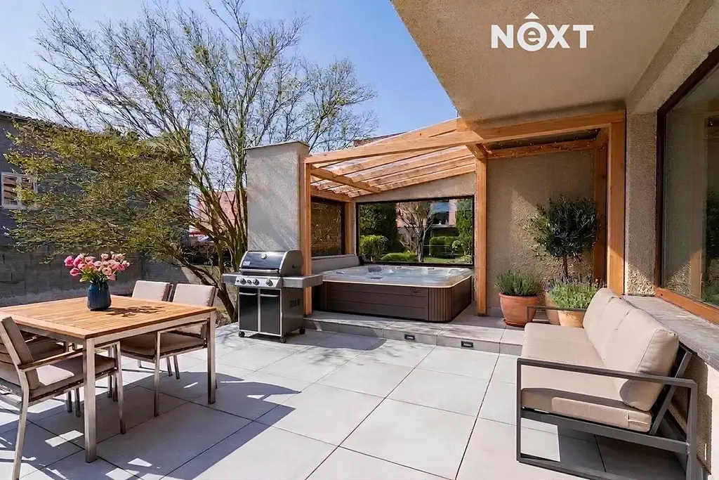 Dům o dispozici 6+kk (171 m2) je kompletně podsklepený (105 m2) a součástí je také garáž (24,2 m2). Spodní patro zaujme velkorysým otevřeným obytným prostorem, který dodává domu vzdušnost a příjemnou atmosféru. Dominantou obývacího pokoje je krb, který vytváří útulné zázemí pro každodenní život. Z obývací části je přímý vstup na terasu, kde si můžete vytvořit relaxační zónu – například s vířivkou či posezením s výhledem do zahrady.
