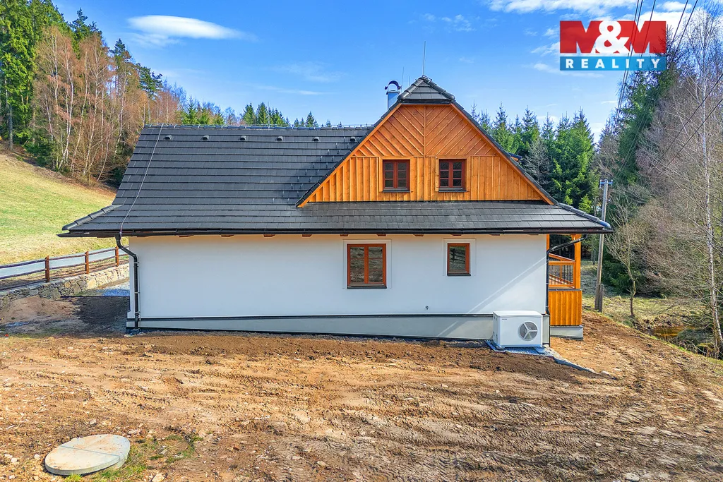 Nabízíme k prodeji výjimečnou novostavbu rodinného domu 5+kk s terasou v naprosto klidné části obce Pustá Rybná. Pozemek o velikosti 2 787 m² (zastavěná plocha 134 m²) poskytuje maximální soukromí, prostor i kontakt s přírodou. Dispozice: přízemí – světlý obývací pokoj s kachlovými kamny a kuchyní, přímý vstup na terasu a zahradu, koupelna s WC, technická místnost, ložnice; patro – ložnice, velký pokoj (dětská herna/pracovna), koupelna se sprchou a WC. Vytápění tepelným čerpadlem (podlahové topení + radiátory), vlastní studna s pitnou vodou. Okrajem pozemku protéká potok Hlučál, který dodává místu jedinečnou atmosféru klidu a pohody. Místo ideální pro relax, rodinný život i víkendový únik z města. Přístup po obecní cestě, dobrá dostupnost okolních měst a služeb. Lokalita Pustá Rybná nabízí čistou přírodu Žďárských vrchů, klid, lesy a skvělé podmínky pro turistiku, cyklistiku i celoroční relax. Domluvte si prohlídku – tohle místo si zamilujete.