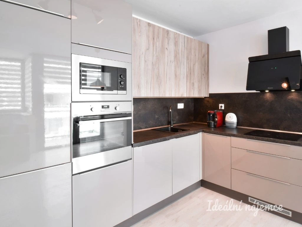 Interiér bytu je moderní a vkusně zařízený. Kuchyňská linka disponuje spotřebiči (lednice, vestavěná trouba, mikrovlnná trouba, sklokeramická deska a digestoř). Obývací část je vybavena pohovkou, televizní stěnou, konferenčním stolkem a knihovnou. V ložnici najdete postel a vestavěnou skříň. Koupelna nabízí vanu, umyvadlo se zrcadlem a pračku, toaleta je samostatná. Velkou výhodou je také další prostorná vestavěná skříň v předsíni, která poskytuje dostatek úložného prostoru.