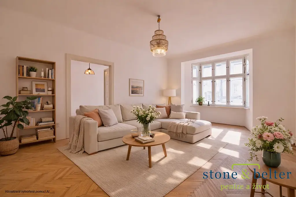 Prostorný byt o velikosti 123 m² se nachází ve 4. nadzemním podlaží prvorepublikové budovy a nabízí 3 velkorysé pokoje (26,6 m², 28 m² a 24,5 m²; vstup do prostředního pokoje je též z vedlejších pokojů), samostatnou kuchyni (12,3 m²), menší pracovnu (5,4 m²) a komoru (1,5 m²), koupelnu (4,7 m²), toaletu (1,7 m²) a balkon s výhledem do vnitrobloku (1,4 m²).