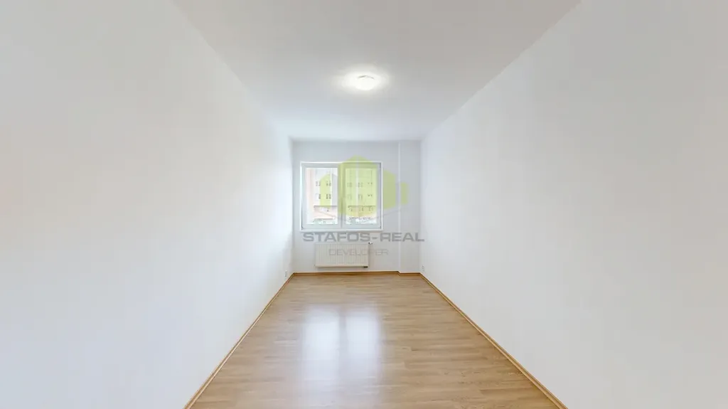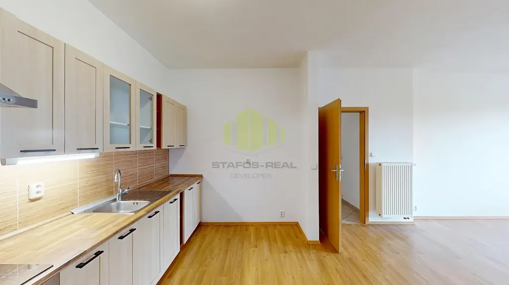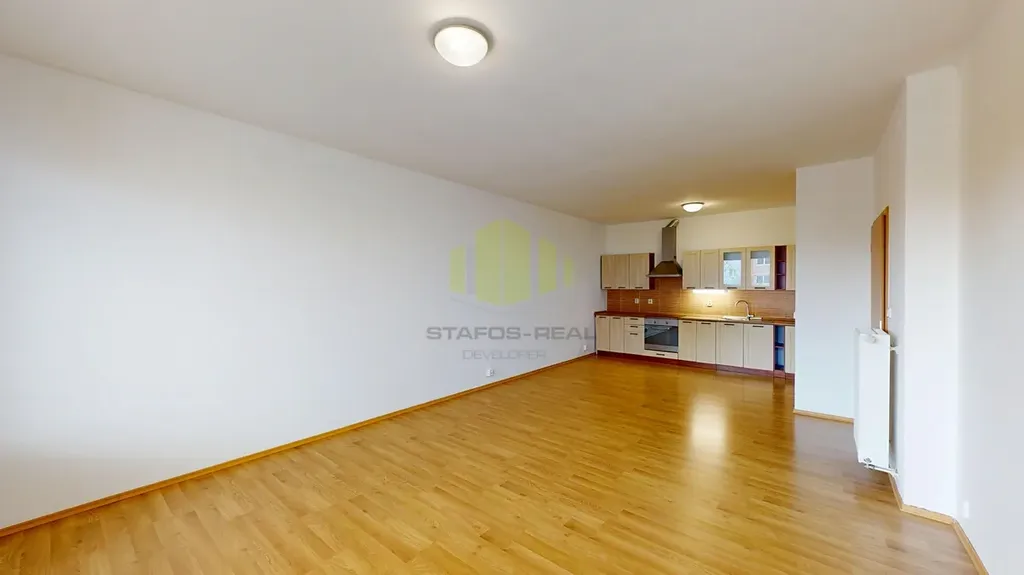 Obývací část je propojena s kuchyňským koutem, který je vybaven kuchyňskou linkou se spotřebiči. Byt se pronajímá nezařízený, což dává novému nájemci možnost přizpůsobit si interiér dle vlastních představ. V obytných místnostech jsou položeny kvalitní podlahy, koupelna a toaleta jsou řešeny samostatně, což zvyšuje komfort bydlení. Další výhodou je praktická šatna poskytující dostatek úložného prostoru.