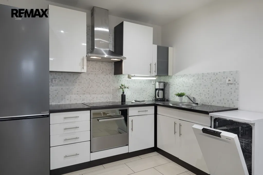 ✅ Kuchyně - vybavená kuchyňská linka s plně integrovanou myčkou š. 45 cm, sklokeramickou varnou deskou a multifunkční vestavnou troubou, digestoří a lednicí. kávovarem, stůl