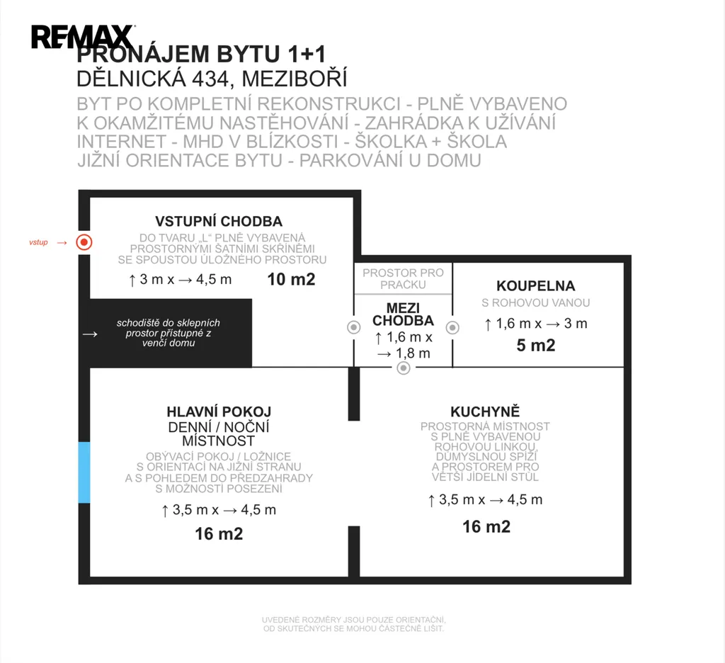 Nabídka dlouhodobého pronájmu bytu 1+1 s podlahovou plochou 60 m² a předzahrádkou cca 40 m2, situovaný v přízemí cihlového zatepleného domu v klidné a vyhledávané lokalitě obce Meziboří – ulice Dělnická 434.