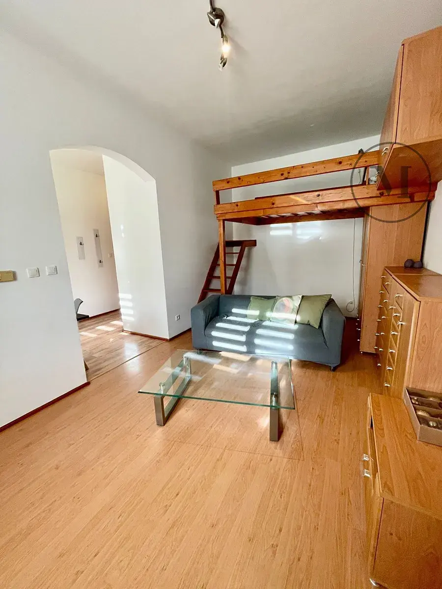 Dispozice: 1+1 (předsíň, kuchyň, obývací pokoj s vyvýšeným spacím patrem)
