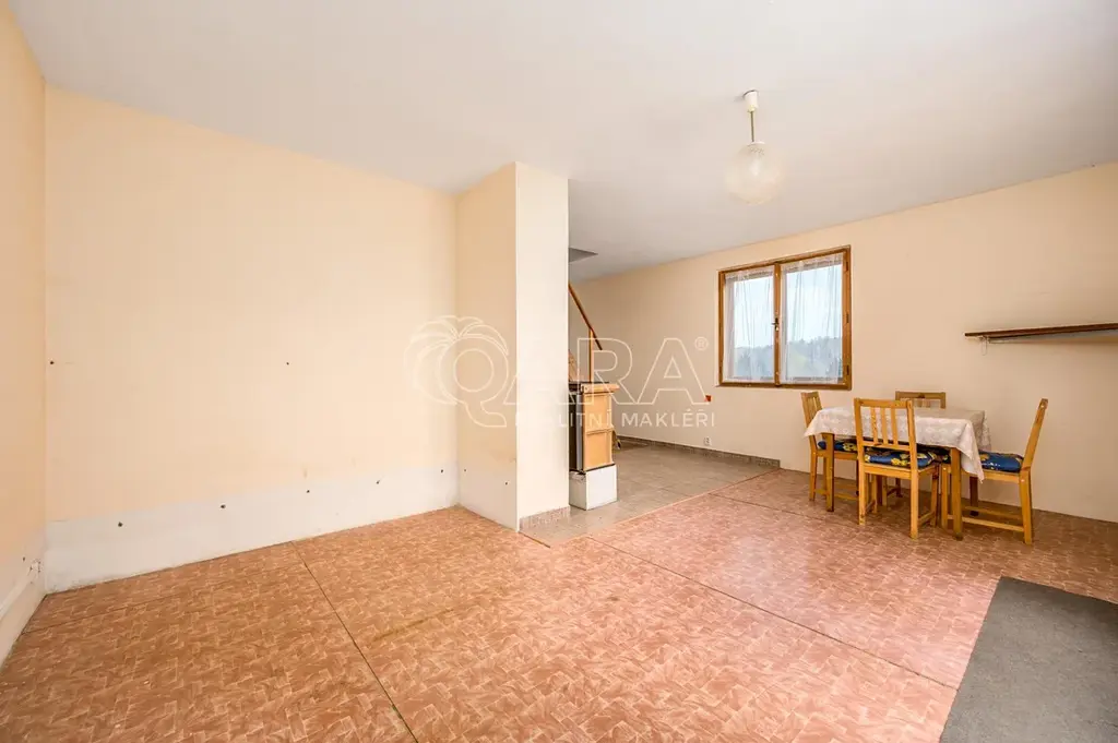 Chata má šikovnou dispozici danou obývacím pokojem se vstupem do zahrady a díky minimalistickému schodišti budete mít příjemný pocit z propojení s kuchyňskou částí. Nacházíme se v přízemí, kde se odehrává veškerý společenský život a také je zde potřebné zázemí, zejména koupelna se sprchou a splachovací toaletou, dále pak komora.