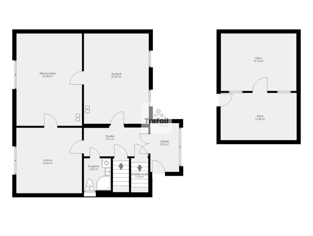 V přízemí vás přivítají dva obytné pokoje a prostorná kuchyně, která může být srdcem celého domova. Dům je podsklepený a už nyní nabízí skvělý potenciál k dalšímu rozšíření – v patře jsou připravené úpravy pro vybudování dalších pokojů.