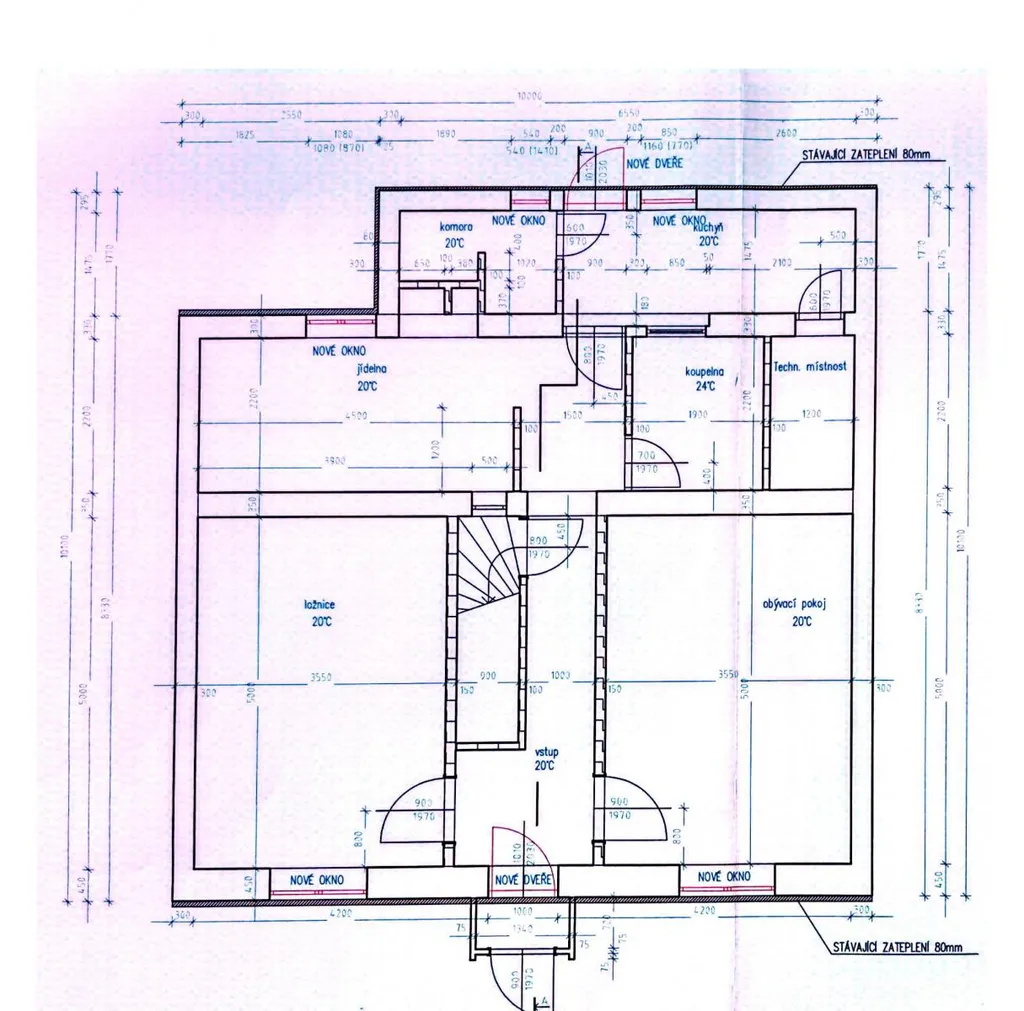 Přízemí: obývací pokoj, kuchyně, pokoj, chodba s předsíní, prostor pod schody, koupelna s vanou, samostatné WC, komora, technická místnost a malý sklep pod koupelnou.