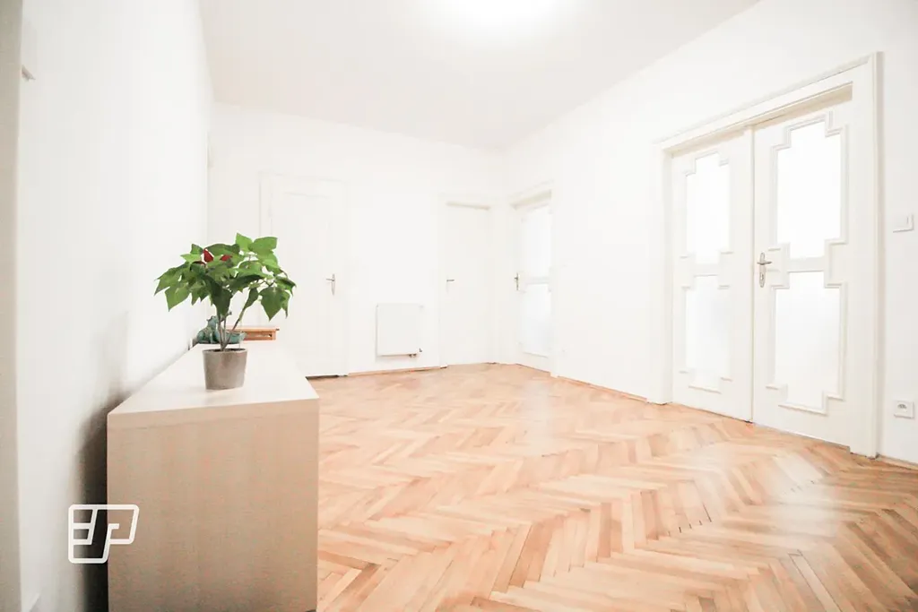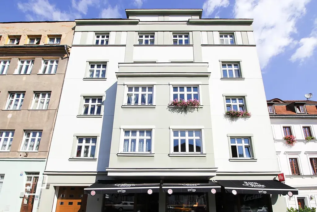 K bytu dále náleží sklepní kóje, menší garáž a parkovací stání ve dvoře domu.