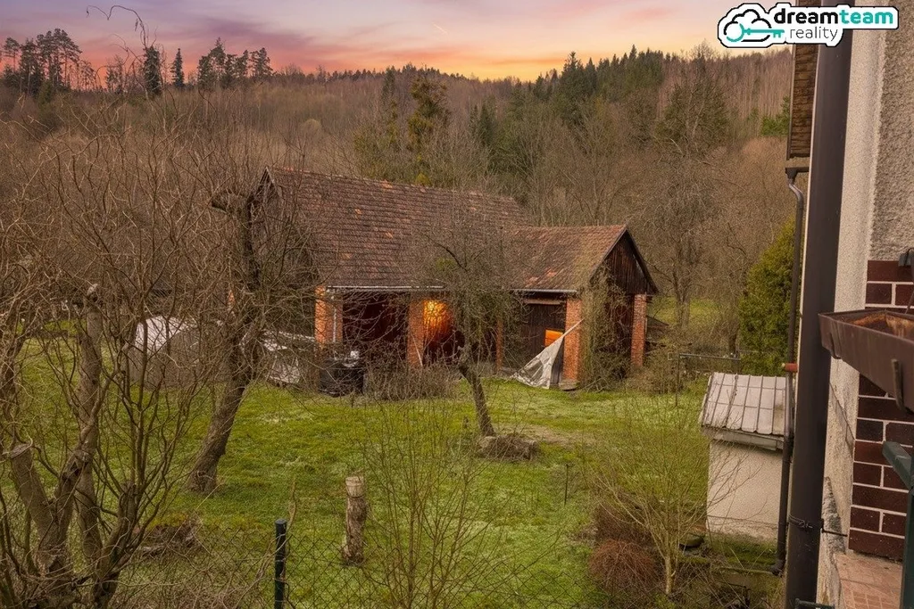 Velká zahrada s potenciálem pro záhony, ovocné stromy nebo jen hamaku mezi dva kmeny. Říčka Bystřička tvoří přirozenou hranici pozemku – dětský ráj, rybářův sen. Jeden soused, nadšený chatař. Klid zaručen. Stačí objednat skleník a sklízet a sklízet.