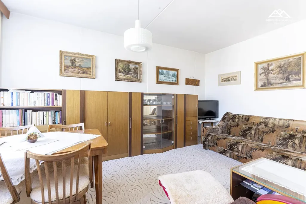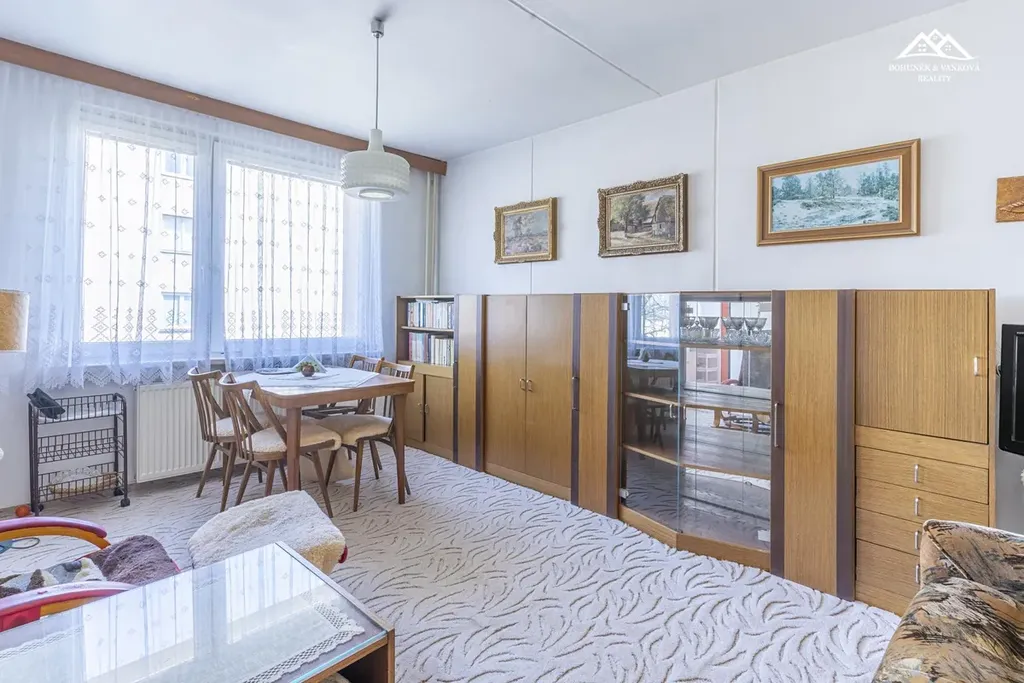 Byt se nachází ve 3. patře panelového domu s výtahem a je dispozičně řešen: prostorná vstupní chodba, komora, kuchyně s kuchyňskou linkou, sporákem a lednicí, obývací pokoj se vstupem na zasklenou lodžii, ložnice s manželskou postelí, koupelna s vanou, umyvadlem, toaleta je odděleně.