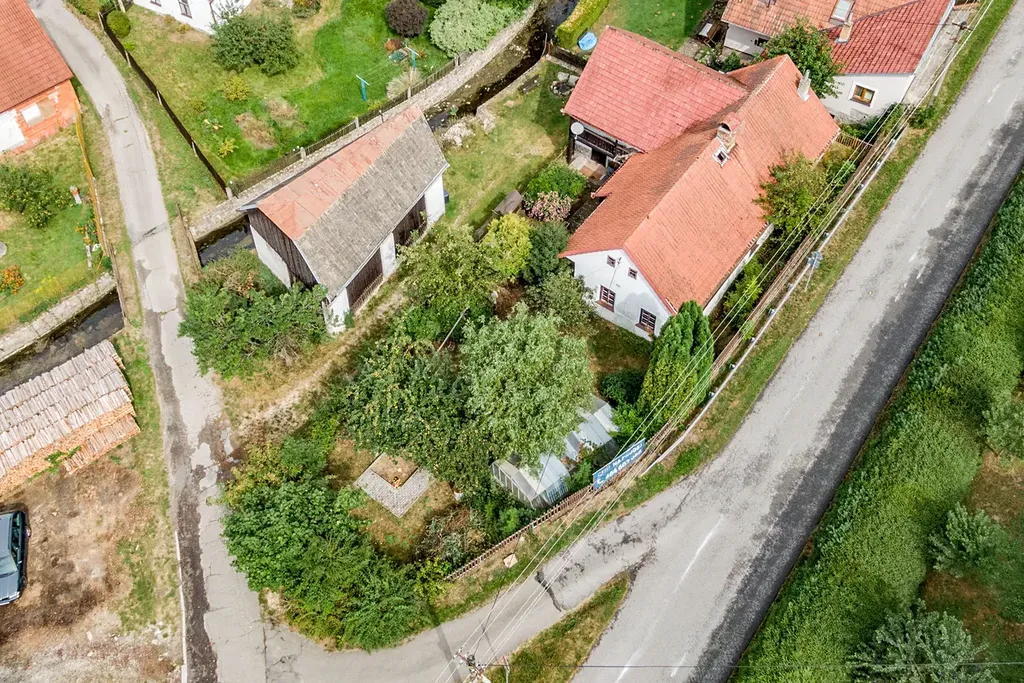 Budova na pozemku o celkové rozloze 689 m2 napojeným na obecní cestu díky které lze zastavit přímo u domu. Dispozice domu je 4+1 o celkové podlahové ploše 125 m2 s možností využití půdního prostoru. Součástí domu je i malý sklípek s možností přístupu z budovy nebo zvenčí. Na pozemku se dále nachází venkovní posezení, dětské pískoviště a improvizovaně zastřešený bazén. Předmětem prodeje je i 60 m2 stodola stojící na dalším pozemku o rozloze 143 m2, která lze využít jako dvougaráž s přímým vjezdem z příjezdové cesty.