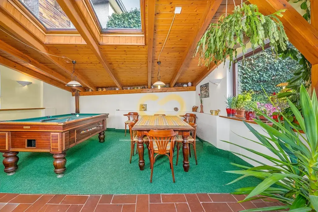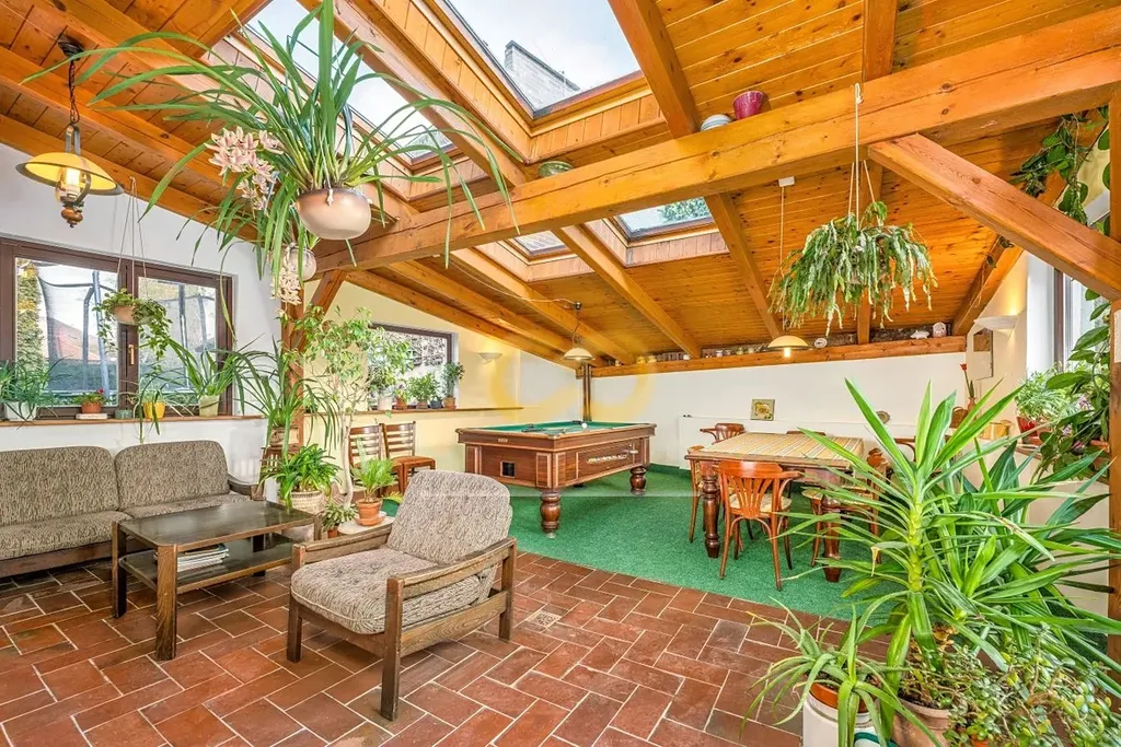 Skutečným bonusem je zimní zahrada s krbem a pohodlným posezením. Vaši hosté si tu mohou připravit kávu, pokochat se výhledem do zahrady nebo si dát partii biliáru. Projít se do ní dá z obou budov.