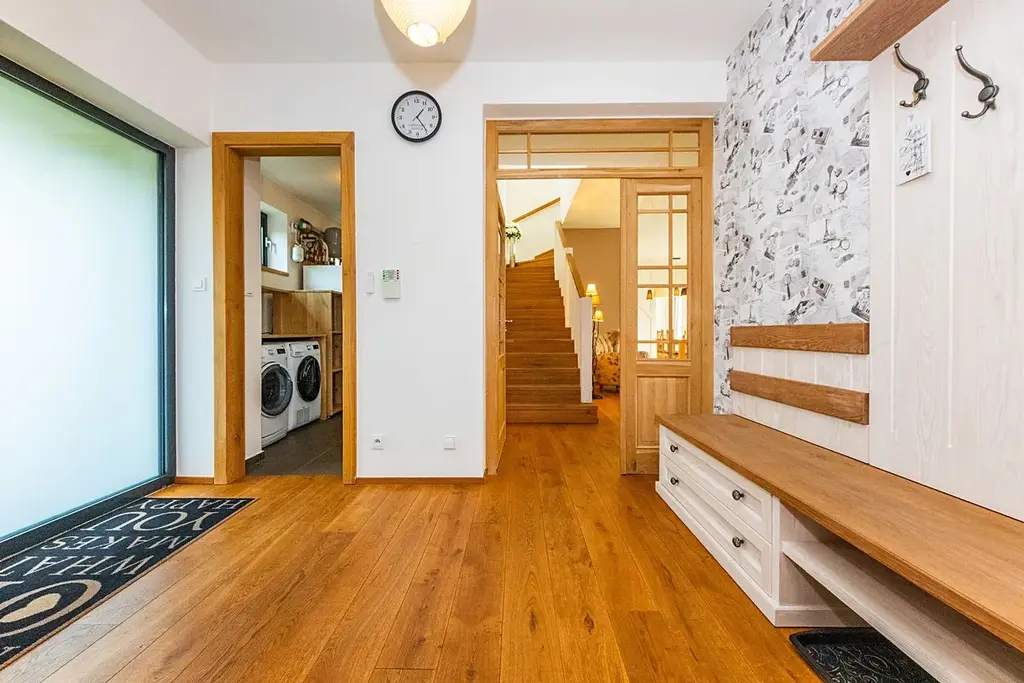 V celém domě dominují masivní dřevěné podlahy a nadstandardní velikost hliníkových oken. Architektura je navržena s důrazem na komfortní rodinné bydlení, úsporný provoz a nadčasový design.