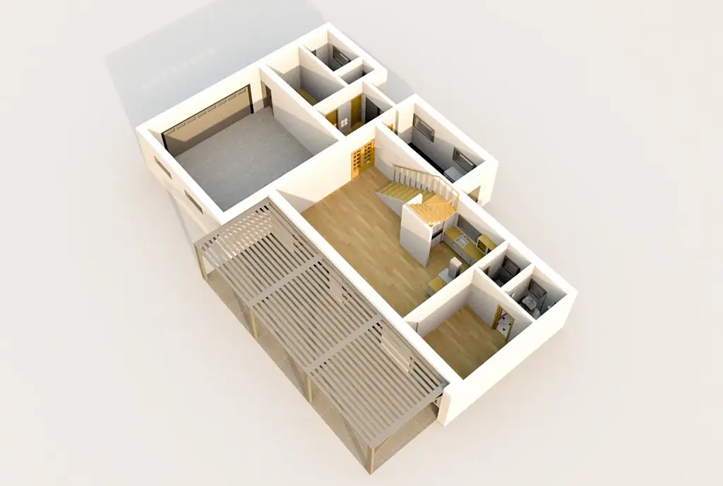 Prostorný obývací pokoj (47,2 m²) s přípravou na krb, jídelnou a kuchyní tvoří srdce celého domu – díky velkým HS portálům je příjemně propojený se zahradou a terasou. V přízemí se dále nachází ložnice/pracovna (13,7 m²), kterou je díky posuvným dveřím možné propojit s obývacím pokojem o celkovém prostoru 61m2. Dále samostatná koupelna se sprchou, toaleta, technická místnost, zádveří a šatna s dostatkem úložného prostoru. Součástí přízemí je i garáž pro 1 vůz se skladem (27,6 m²).
