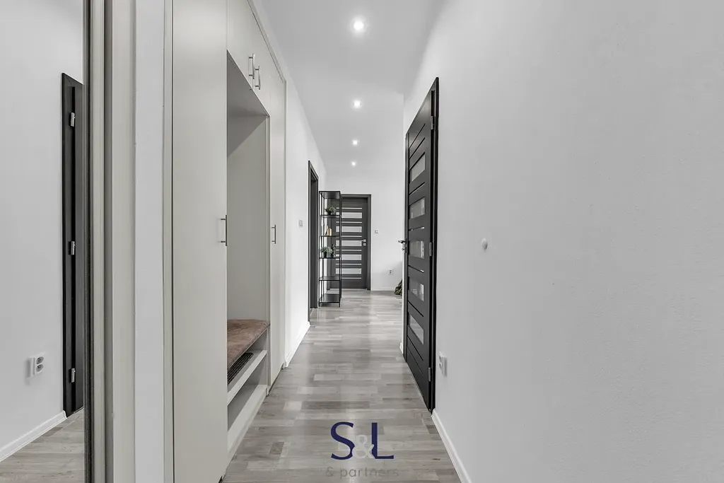 Dispozice bytu je prakticky řešená a vhodná pro rodinné bydlení. Byt je vybaven plovoucími podlahami, v koupelně je položena dlažba. Plastová okna s dvojsklem jsou doplněna roletami den a noc, které zajišťují komfort i soukromí. Jedna z ložnic a předsíň disponují vestavěnými šatními skříněmi, druhá ložnice je vybavena rohovou šatní skříní, která efektivně využívá prostor.