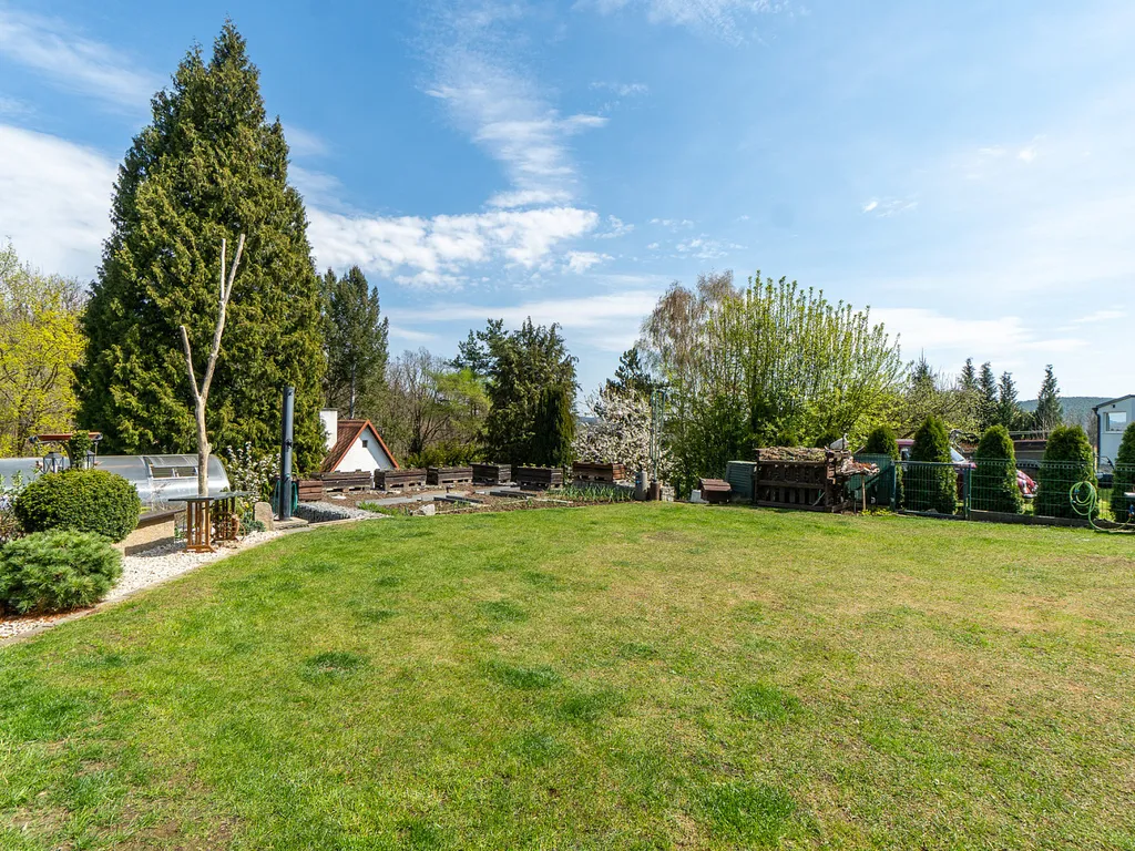 Zahrada je skutečnou oázou klidu – najdete zde ovocné stromy (švestka, jabloň, hrušeň) i keře (maliny, borůvky, ostružiny), skleník, udírnu i dřevník. Praktický je také zahradní domek s přívodem elektřiny a vody.