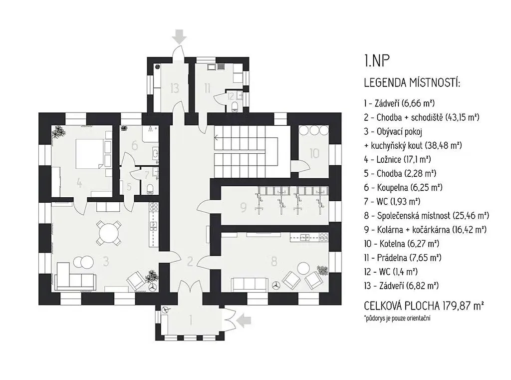 - technické zázemí (sklep, prádelna, kolárna)