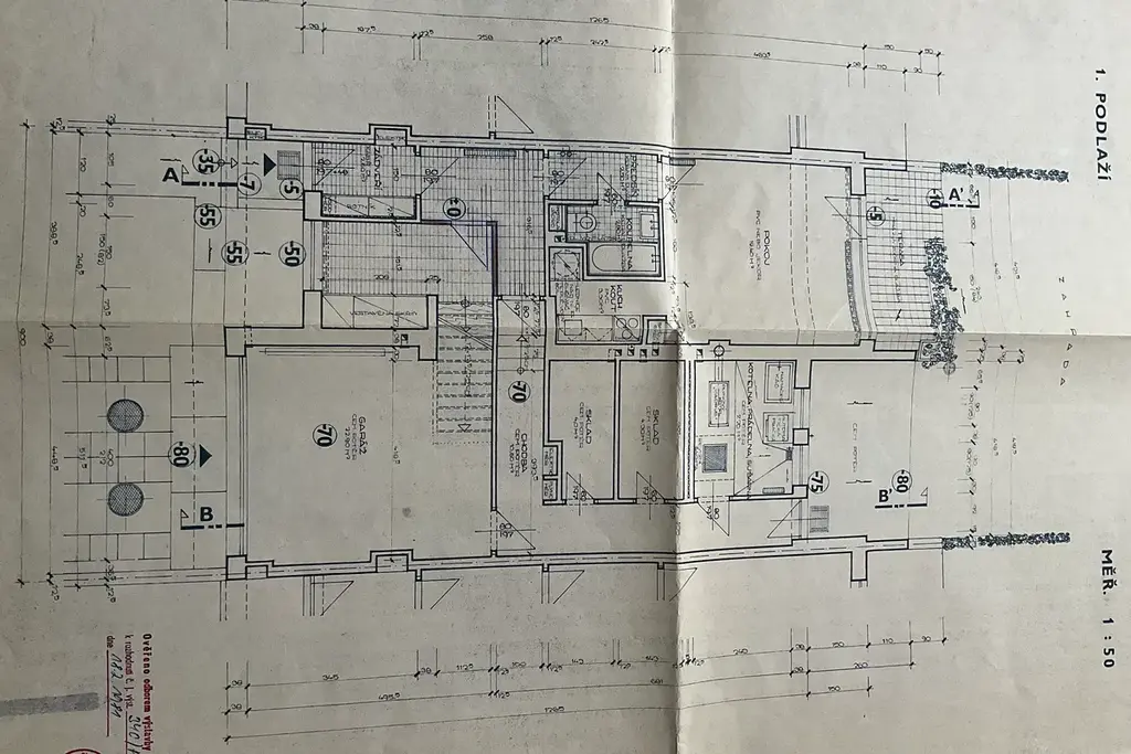 V přízemí domu je z ulice oddělený vstup do garsonky s příslušenstvím, vstup do patra domu přes prosklenou verandu a vstup do prostorné garáže. Je zda také technické zázemí domu - kotelna, skladové prostory a místnost se vstupem na zahradu, kde může být zřízen další obytný pokoj. Garsonka má okna a vstup na zahradu a může být užívána nezávisle na zbytku domu.