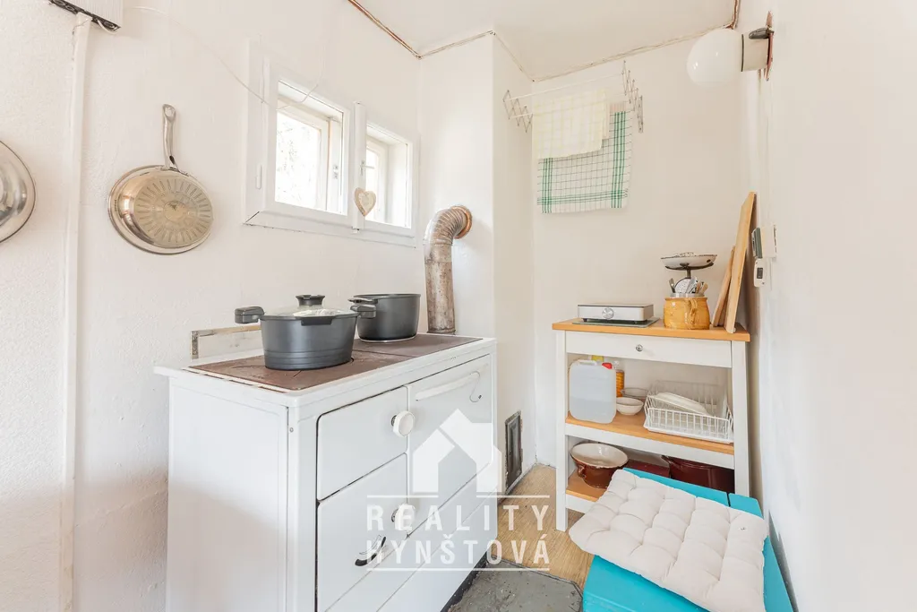 V přízemí je obývací pokoj s kuchyňkou, komora a vstup na terasu, kde se nachází i suchá toaleta. Po dřevěných schodech vystoupáte do obytného podkroví se dvěma pokoji. A pro uskladnění výpěstků poslouži sklep.
