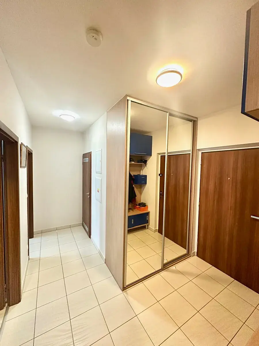 Vstupem do bytu se ocitnete v předsíni o ploše 10 m2, z které je vstup do všech obytných místností. Po levé straně od vstupu se nachází obývací pokoj o ploše 5,6 x 4,4 m ( 24,7 m2 ) s kuchyňským koutem o ploše 3,8 x 2,27 m ( 8,6 m2 ), který je ve výklenku a tím nezasahuje do obytné plochy pokoje. Z obývacího pokoje je vstup na balkon o ploše 9 m2 s výhledem do okolí. Po levé straně od obývacího pokoje se nachází koupelna o ploše 5 m2 s vanou, umývadlem a prostorem na pračku a sušičku. Vedle koupelny je umístěna samostatná toaleta o ploše ( 1,3 m2 ) s umývadlem. Proti vstupu do bytu je vstup do ložnice o ploše 2,95 x 4,4 m ( 13 m2 ) a hned vedle ložnice se nachází dětský pokoj o ploše 3,2 x 4,4 m ( 14 m2 ). Oproti dětskému pokoji je ještě umístěna komora o ploše 1,7 x 1 m ( 1,7 m2 ).