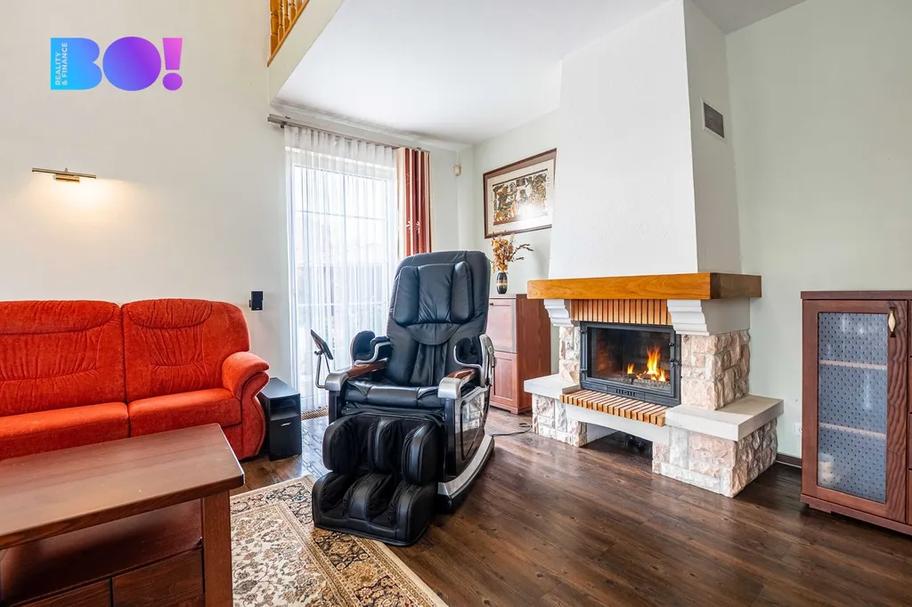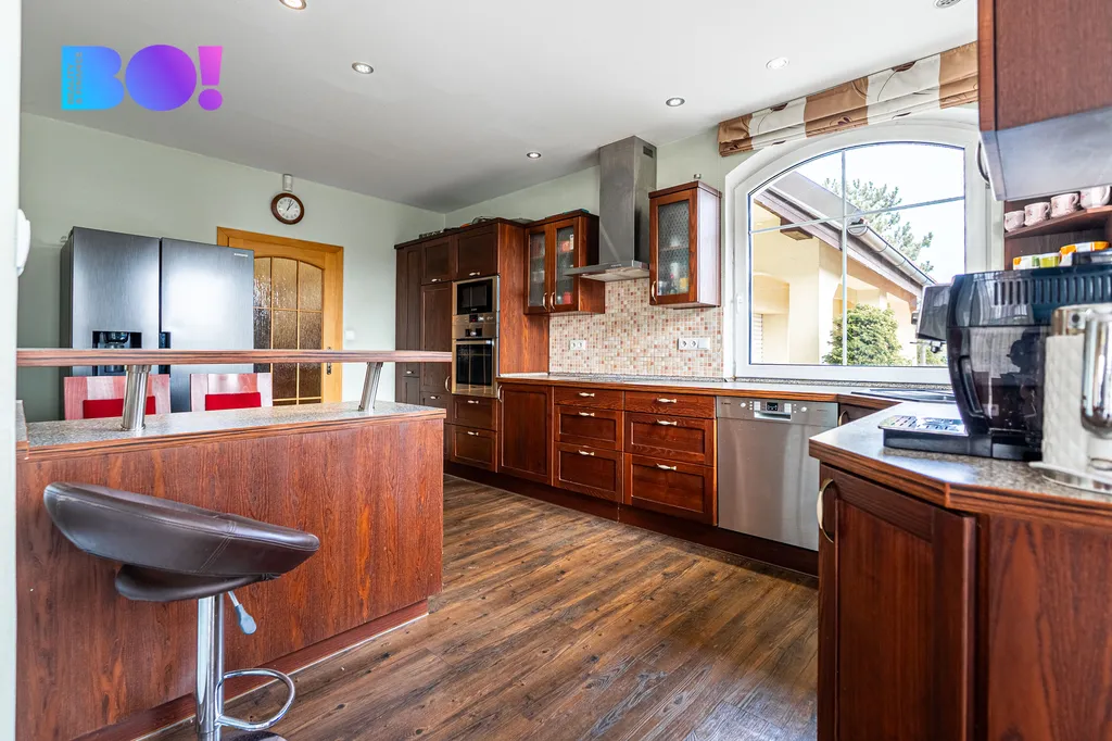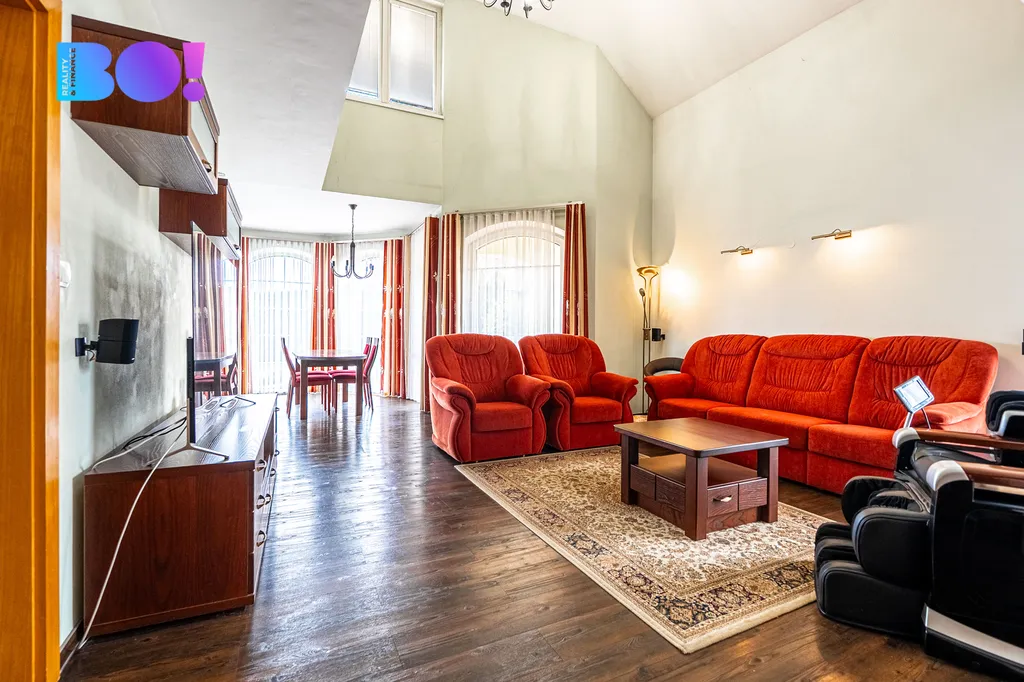 Samotný dům o dispozici 5+kk nabízí obytnou plochu 225 m² a už při vstupu působí velmi příjemně. Interiér je řešen s důrazem na dostatek prostoru, světla a pohodlí, což podtrhuje zejména obývací pokoj se stropem vysokým až 5,5 m, který domu dodává otevřenost a vzdušnost. Celkovou atmosféru navíc umocňuje krb, jenž interiéru propůjčuje útulnost, zatímco prostorné pokoje zvyšují komfort každodenního bydlení.