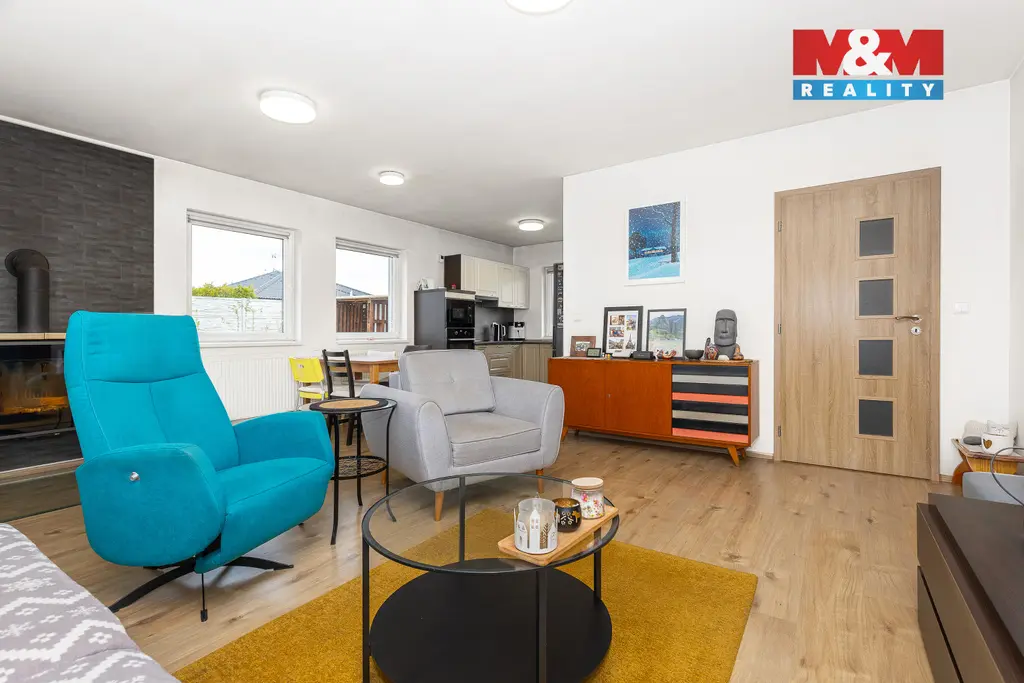 Dominantou domu je prostorný a světlý obývací pokoj s kuchyňským koutem, ze kterého je přímý vstup na zastřešenou terasu – ideální místo pro relaxaci i posezení s rodinou či přáteli. Součástí je okrasná zahrada s minimálními nároky na údržbu, která poskytuje dostatek soukromí i prostoru pro odpočinek.
