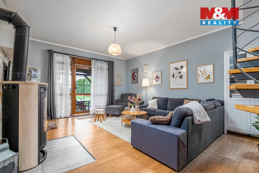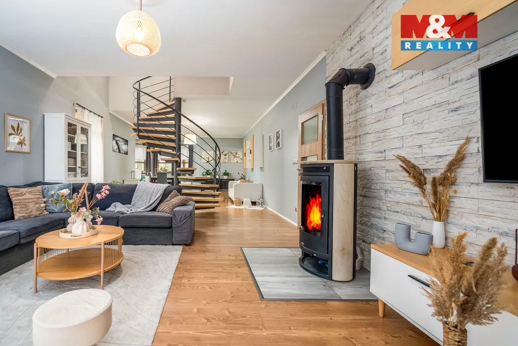 Dominantou obytné části jsou krbová kamna, která dodávají interiéru jedinečné teplo domova a vytváří příjemné prostředí během chladných večerů.