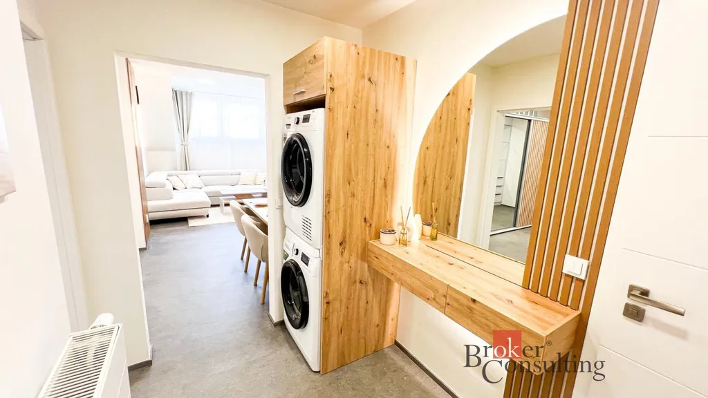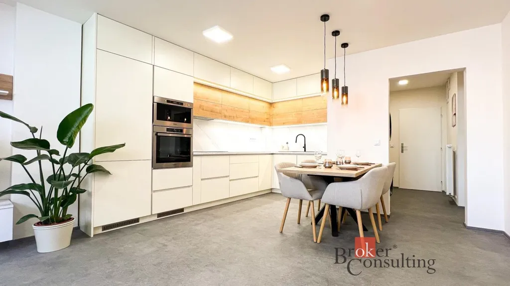 Nabízíme k pronájmu moderně řešený byt, který zaujme kvalitním zpracováním a nadčasovým designem. Interiér je laděn do světlých tónů v kombinaci s přírodními dřevěnými prvky, což vytváří příjemnou a útulnou atmosféru.
