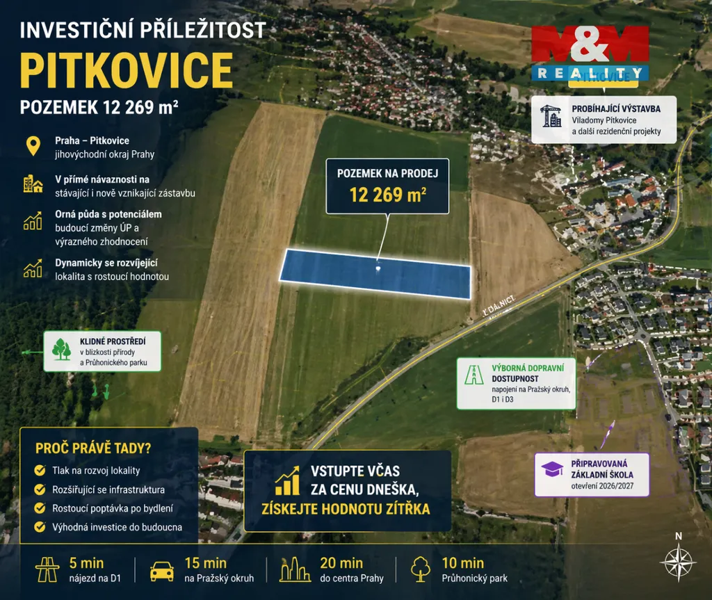 Pozemek je veden jako orná půda, nicméně s ohledem na dynamický rozvoj okolí a probíhající výstavbu představuje zajímavou investici s potenciálem budoucí změny územního plánu a tím i výrazného zhodnocení.