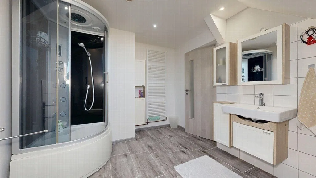 2.nadzemní podlaží: schodiště, chodba, sklad, koupena (WC a sprchový kout) a tři průchozí pokoje. Půdorysy všech podlaží domu naleznete ve fotogalerii.