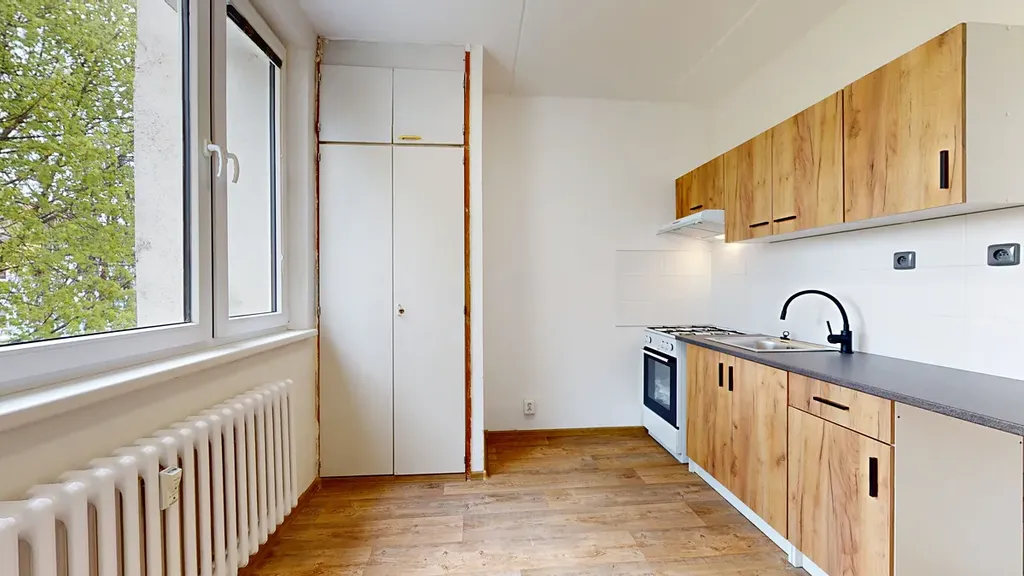 Byt je zrekonstruovaný: nové vinylové podlahy, nové interiérové dveře, nové jádro a koupelna, nová kuchyňská linka.