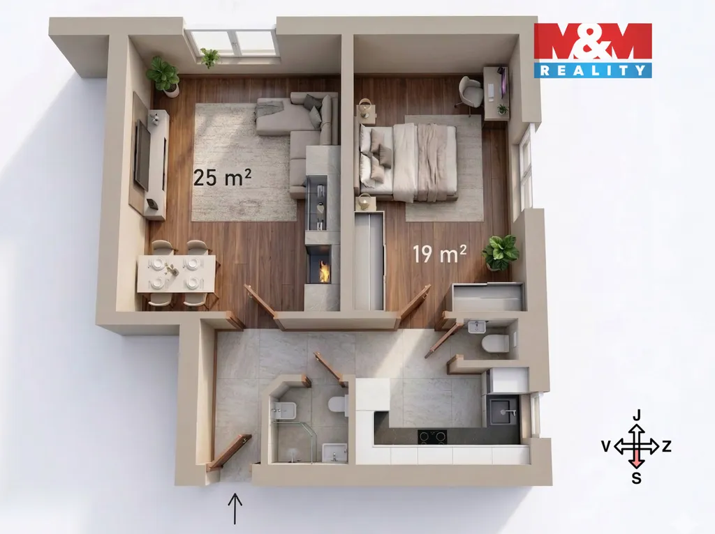 Okna jsou orientována na jih a západ. Pokoje 25 m2 a 19 m2, kuchyně 5,4 m2, předsíň 4,8 m2, koupelna 2,8 m2, WC 1,2 m2, sklep5 m2.